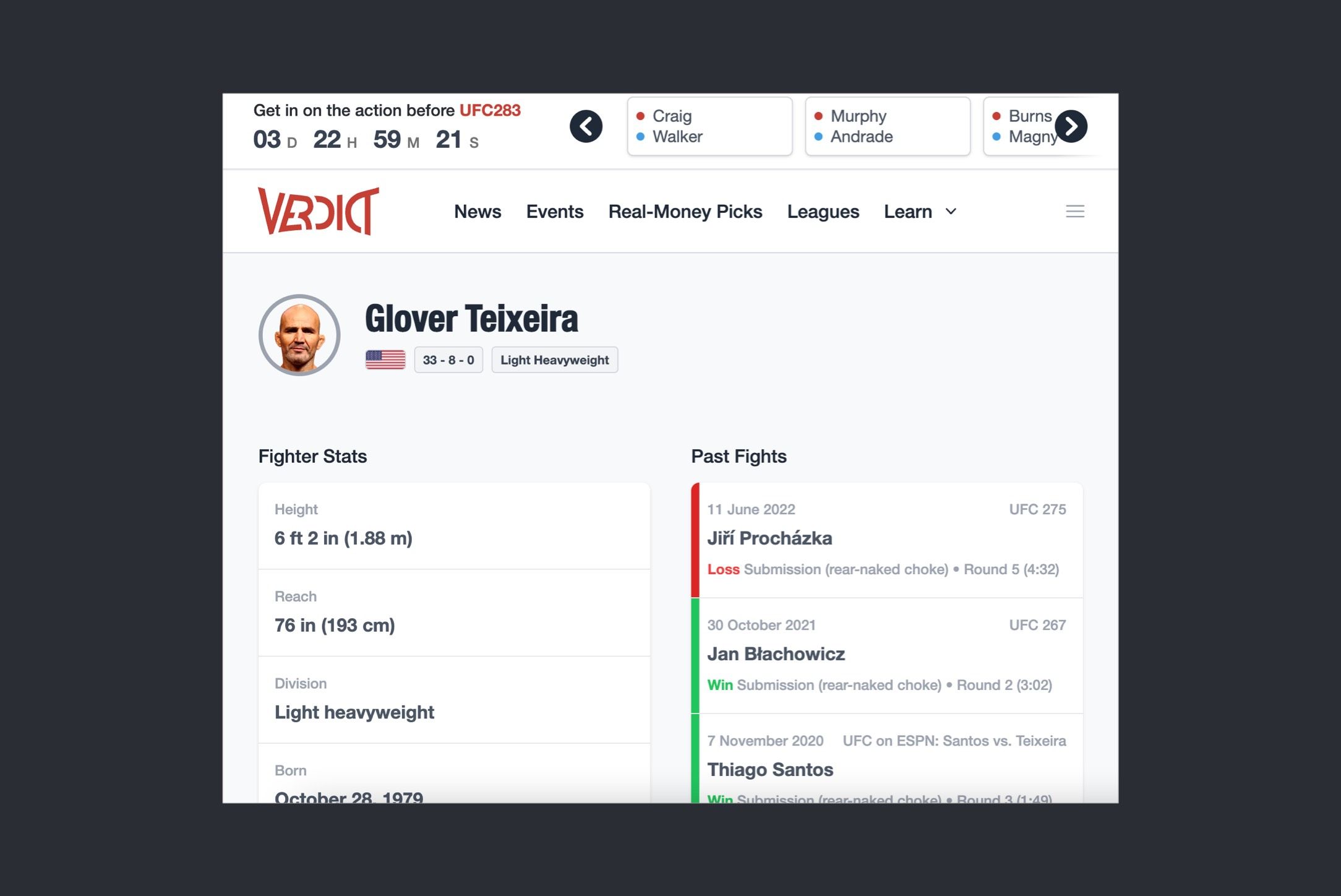 Verdictmma.com is far more than just a news website. Visitors come to our site to make their picks, score fights, interact in comments, view data, read news, and learn about the sport.