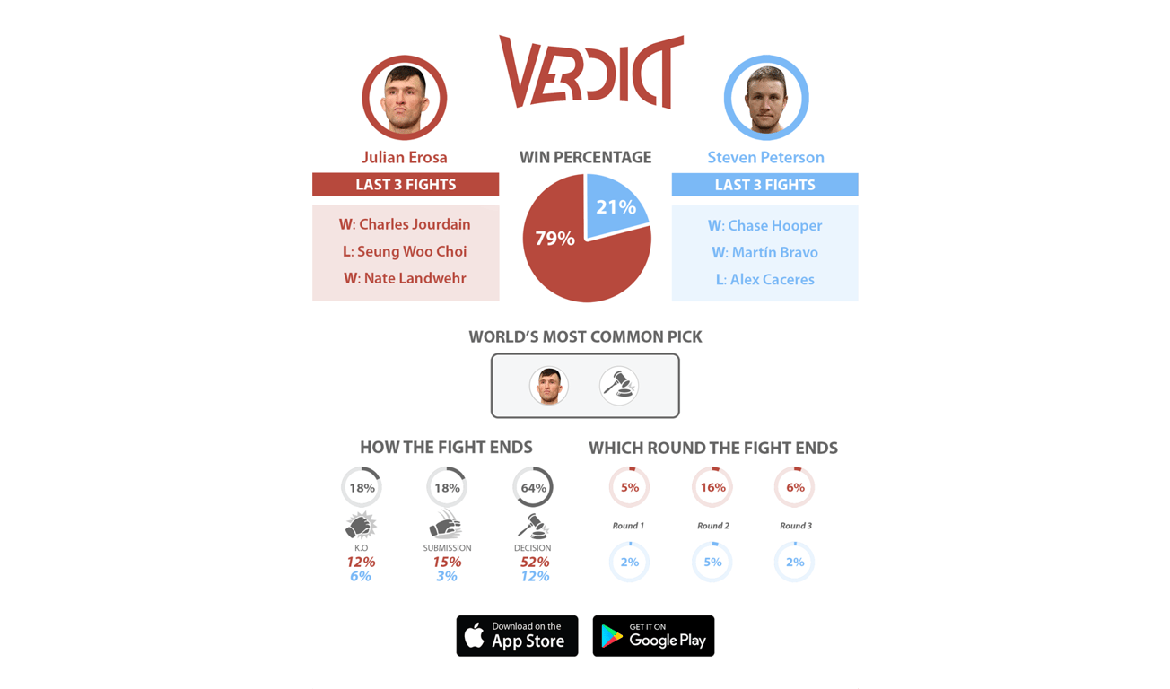Erosa and Peterson made their professional debuts within 3 months of each other in late 2010. Erosa’s been the more active of the two with 35 professional fights compared to Peterson’s 28 professional fights. Erosa is heavily favored, with 79% of the Verdict Community predicting him to defeat Peterson.