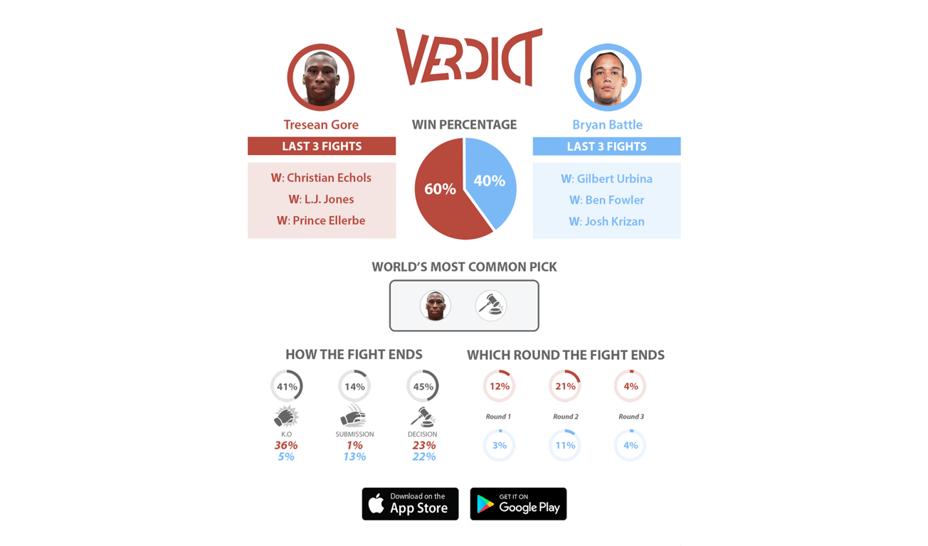 This fight was supposed to be the finals of Season 29 of The Ultimate Fighter. Tresean Gore was forced to withdraw from the finals last September against Battle after suffering a knee injury. Battle went on to defeat Gilbert Urbina to win the Ultimate Fighter finale. This will be Gore’s official UFC debut. Battle is on a 5 fight winning streak in which he finished every opponent. The majority of the Verdict Community are predicting Gore to win with 36% predicting him to finish Battle by knockout.
