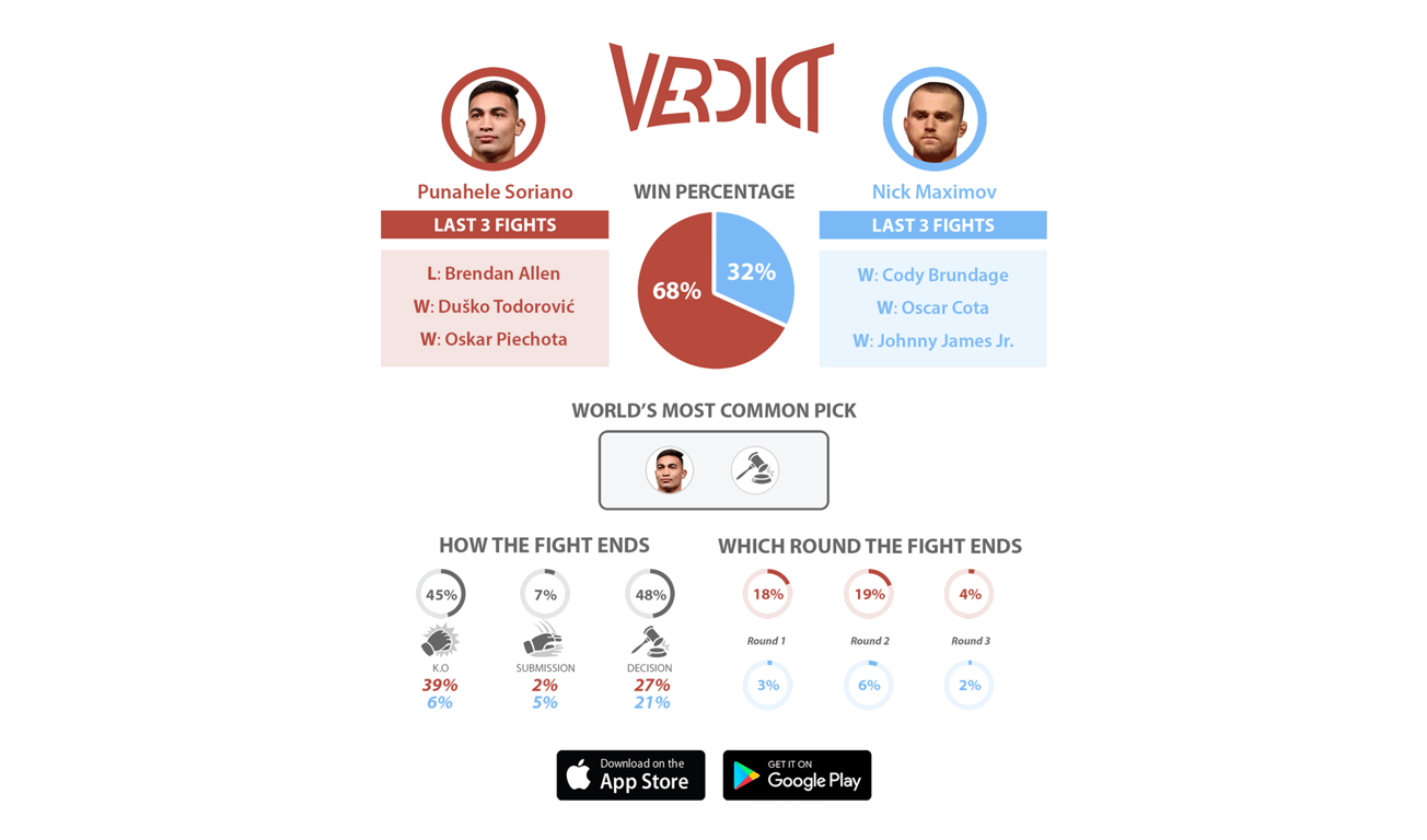 The Nick Diaz army will be represented this weekend as Nick Maximov will compete on his first UFC main card this weekend against Punahele Soriano. Not only is this fight on the main card, it’s the co-main event. Maximov is coming into this fight undefeated at 7-0. Prior to Punahele Soriano’s last fight, he was also undefeated. He suffered the first loss of his professional career against Brendan Allen in July of 2021. Soriano has the opportunity to bounce back from his first career loss while Maximov is trying to keep his undefeated streak going. Though Maximov is undefeated, only 32% of the Verdict Community are picking him to defeat Punahele Soriano.