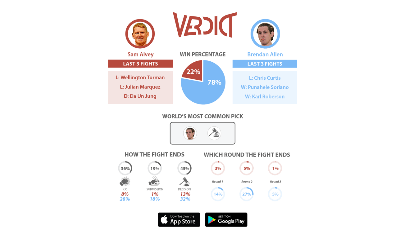 Brendan Allen took this fight on less than one week notice after Phil Hawes withdrew from his fight against Alvey. Even on one week’s notice, 78% of the Verdict Community are still picking him to defeat Sam Alvey. This is likely a do or die fight for Alvey, who hasn’t won a fight in his last 7 UFC appearances. Alvey’s last win inside the Octagon was a split decision against Giann Vilante nearly 4 years ago.