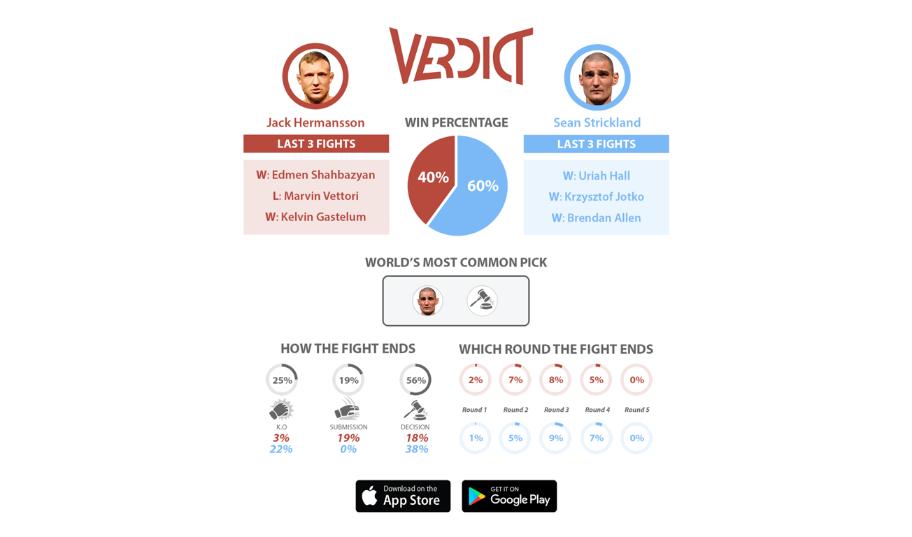 Sean Strickland will compete in his 2nd consecutive UFC main event this weekend when he takes on 6th ranked Jack Hermansson. Strickland is currently on a 5 fight winning streak and is coming off of a 5 round shutout performance against Uriah Hall. If you look at the numbers, this feels like a classic striker vs. grappler fight with 22% of the Verdict Community predicting Strickland to win by KO and 19% predicting Hermansson to win by submission. If Strickland wins, he’s on a shortlist of potential title challengers in the Middleweight division.