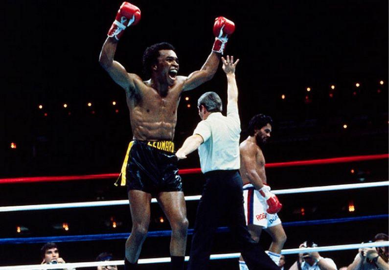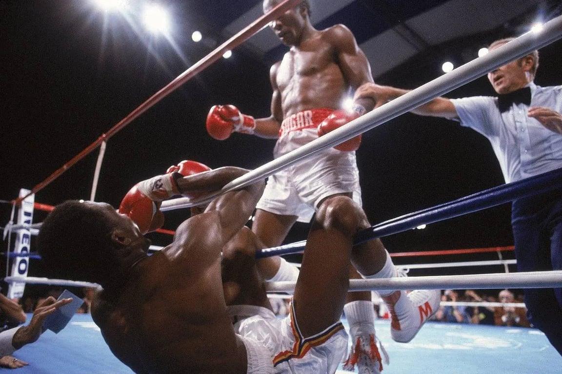 Shortly after Leonard’s fight with Duran, he would take on Thomas ‘The Hitman’ Hearns in September of 1981 on ABC. In a back and forth title bout, Leonard came away with the 14th round knockout win despite trailing on the scorecards to Hearns, who had done well to outpoint Leonard to that point. Hearns acted as the stalker, walking down Leonard while he boxed from a distance. By the midway point of the fight, Leonard had accrued damage to his eye and face and had to battle through adversity to hurt Hearns. After realizing he would need to do something miraculous to win, Leonard did just that, bludgeoning Hearns in round 13 and 14 until the referee was forced to stop the fight.