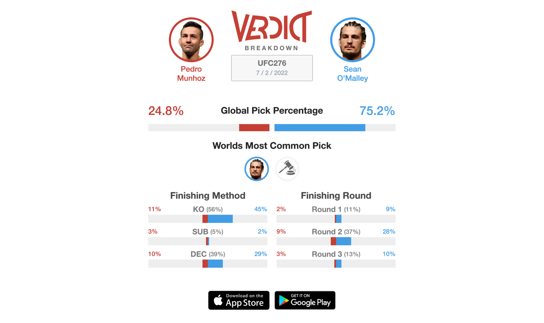 As of now, 75.2% of the Verdict Community predicts Sean O'Malley will defeat Pedro Munhoz at UFC 276. This fight will open up the main card.