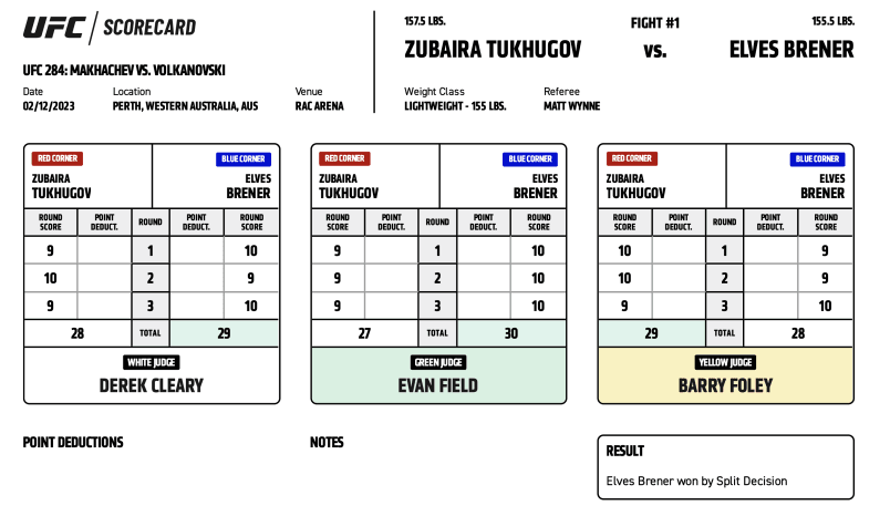 UFC 284 began with controversy as the night's first fight resulted in a heavily disputed split decision win for Elves Brenner over Zubaira Tukhugov. The commentary team in Perth, Australia, was left stunned by the decision, as were many fans, so let's see if the judges got this one right.