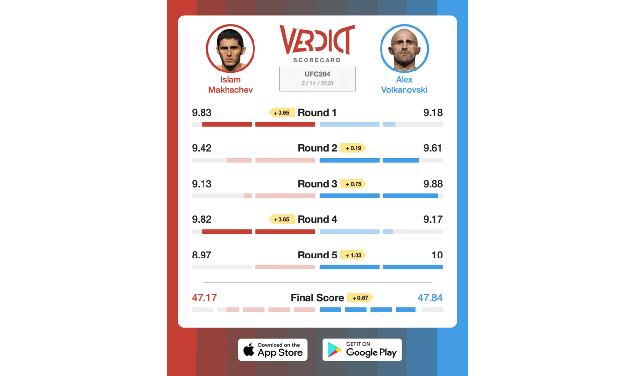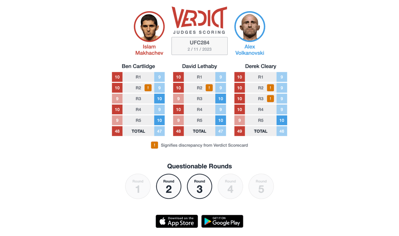 As The Verdict Scorecard indicates, while the slight edge is given to Volkanovski, this fight was extremely close, with round 2 being the deciding factor. A 48-47 scorecard for either fighter is acceptable, but 49-46 seems like a bit of a reach from Derek Cleary.