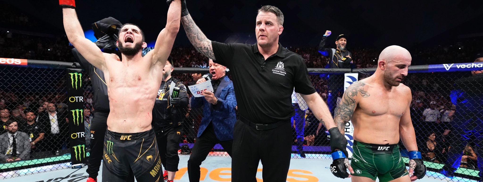 Islam starts the round with a big right hand and a follow-up. Volk begins chipping away with leg kicks. Islam cuts Volkanovski wide by the left eye and lands a takedown. They return to the feet, and Volk denies another attempt at bringing the fight to the mat. Huge left-hand lands as Islam closes the distance and they go down with a minute left. Volkanovski tries to rain down shots, but Islam controls the hands. Alas, a few get through, and the fight is over.