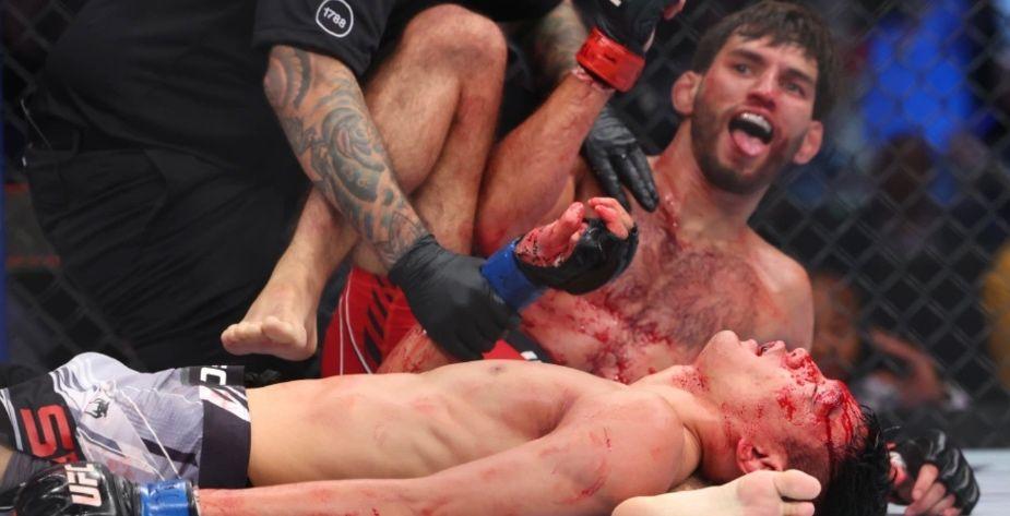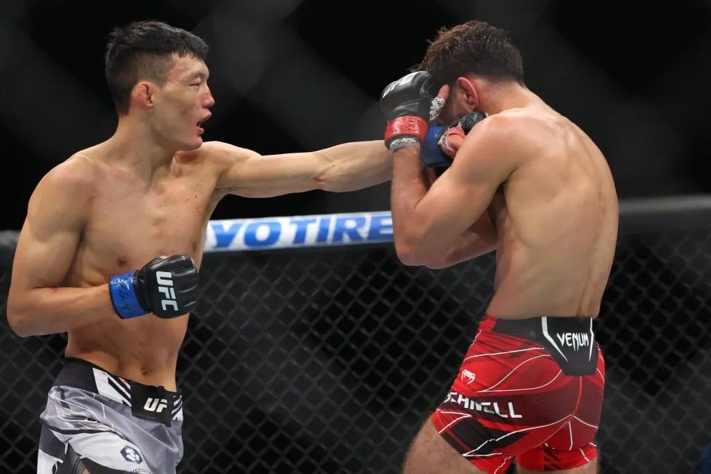 Schnell recovered from the strike, and Sumudaerji, knowing he had Schnell hurt, welcomed him back to his feet. Schnell pressured forward, knowing he needed to get one back against Sumudaerji, but was welcomed with a stabbing side-kick to the body. Then, Sumudaerji landed a massive elbow straight over Schnell's guard, which sent him kneeling on the canvas. He quickly got back up and was hit with another chopping elbow, another, and then another. Sumudaerji threw everything at Schnell, landing punches around Schnell's guard and clipping him with his long knees. Schnell looked every bit out on his feet, and it appeared that one more strike would surely spell the end of the bout. Yet Schnell still pressured forward, getting clipped with more straight shots, stumbling backward. Sumudaerji kept throwing strikes, and a labored Schnell threw two uppercuts, landing on Sumudaerji hard. A hurt and tired Sumudaerji backed away, noticeably fading. Schnell pressured forward again, hitting Sumudaerji with a straight, which rocked Sumudaerji's head back. Determined to get one back, Sumudaerji tried his own straight, but Schnell was conditioned to them by this point and quickly ducked under it and secured a takedown. Schnell postured up and landed heavy ground strikes on Sumudaerji, nearly stopping him with elbows. At the last minute, Sumudaerji managed to reverse position and get on top. Schnell wrapped his legs over and under Sumudaerji and locked him in a tight triangle choke. Sumudaerji tried everything to survive, fighting and pushing away from Schnell at every opportunity. But it wasn't enough; Sumudaerji lost consciousness, and Matt Schnell completed the most remarkable comeback of 2022. While Sumudaerji was unconscious, Schnell looked at the cameras and asked for his bonus, which he rightfully got alongside Sumudaerji for the Fight of The Night.