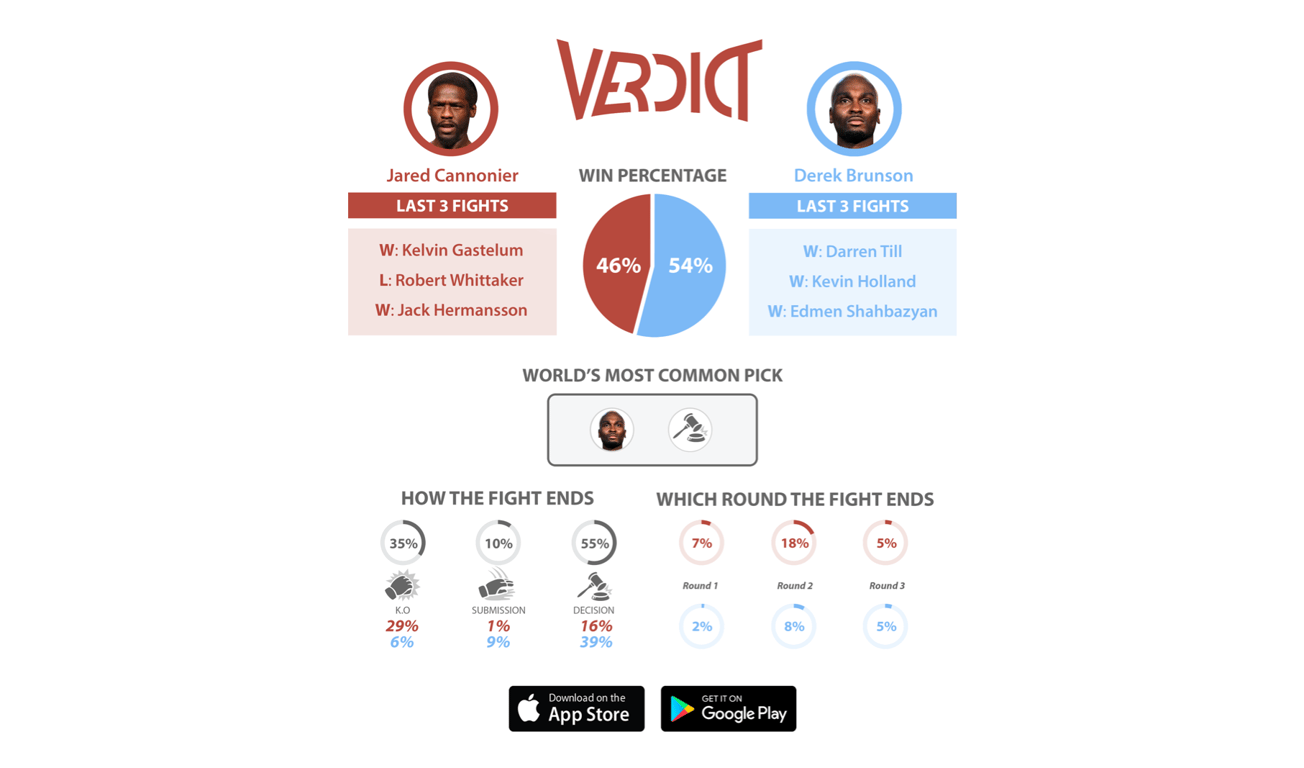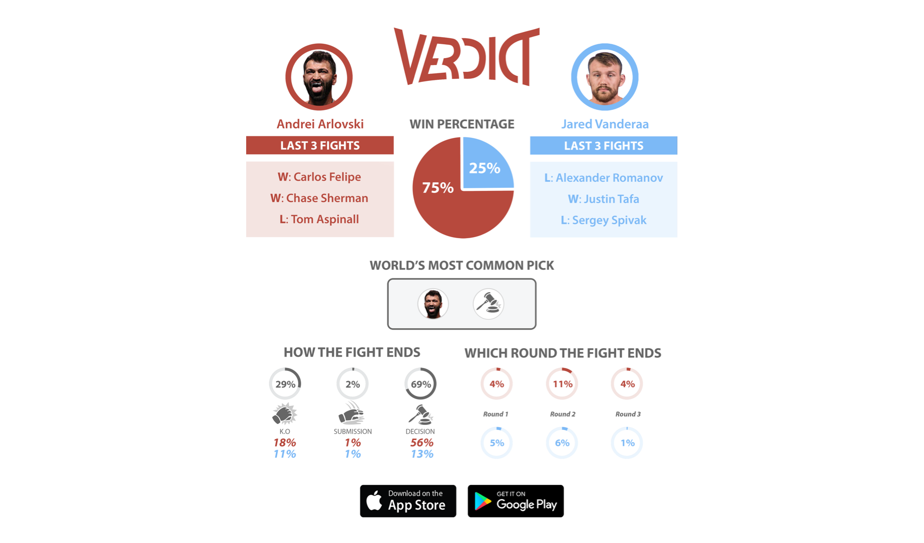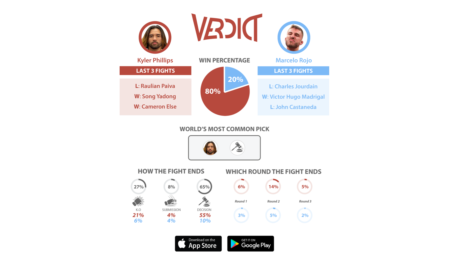 Kyler Phillips is the biggest favorite on Verdict heading into UFC 271, with 80% predicting him to defeat Marcelo Rojo. Prior to losing his last fight against Raulian Paiva, Phillips handed Song Yadong his first loss in the UFC. Both Phillips and Rojo are looking to get back into the win column after losing their last fight. The Verdict Community is expecting this fight to go long, with 65% predicting it will go to a decision.