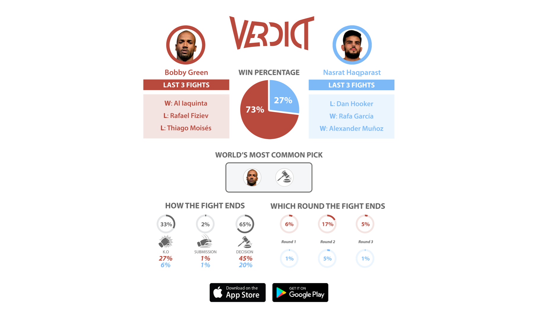 Since the start of the pandemic, Bobby Green has found his stride as a fighter. In his last fight, he became the first fighter in history to finish Al Iaquinta by knockout. Even in his loss to Rafael Fiziev, Bobby Green ended the fight very strong. He’ll now take on Nasrat Haqparast who’s looking to bounce back from a loss against Dan Hooker. Green is a big favorite, with 73% of the Verdict Community predicting him to win. This fight will kick off the main card for UFC 271.