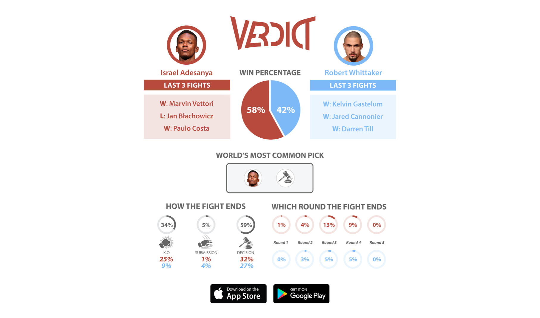 Since their first fight at UFC 243, Israel Adesanya and Robert Whittaker have remained the two best Middleweight fighters on the planet. Whittaker has admitted that he was angry going into the first fight and wanted to brawl with Adesanya. This worked in Adesanya’s favor who was able to counter Whittaker’s aggression with incredible accuracy which led to a 2nd round knockout. After seeing Jan Blachowicz defeat Adesanya with wrestling, Whittaker has eluded to using his entire skillset in this rematch. This means we could very well see Robert Whittaker imploring a wrestling heavy gameplan. Whereas 60% of the Verdict Community predicted Whittaker to win the first fight, only 42% are predicting him to win the rematch. That’s still a high number considering how the first fight went. There are more people picking Whittaker to defeat Adesanya than there were people that picked Yoel Romero, Paulo Costa, and Marvin Vettori to defeat Adesanya.