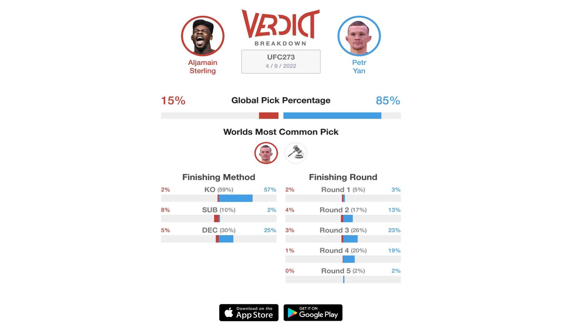 The long-awaited rematch between Aljamain Sterling and Petr Yan will finally take place at UFC 273. The first fight ended in one of the most controversial finishes in UFC history after Petr Yan was disqualified for hitting a grounded Aljamain Sterling with an illegal knee. With this win, Aljamain Sterling became the first and only fighter in UFC history to win a Championship by disqualification. For the past year, Sterling has been criticized for not continuing to fight. He hasn’t been able to enjoy his time as UFC Champion and hasn’t gotten the respect that a UFC Champion should. He’ll get his opportunity to earn the respect of a Champion at UFC 273. Prior to the first fight, the Verdict Community was dead split at a 50/50 on who they thought would win the fight. It’s a different story headed into the rematch, as 85% of the Verdict Community predicts Yan to defeat Sterling.