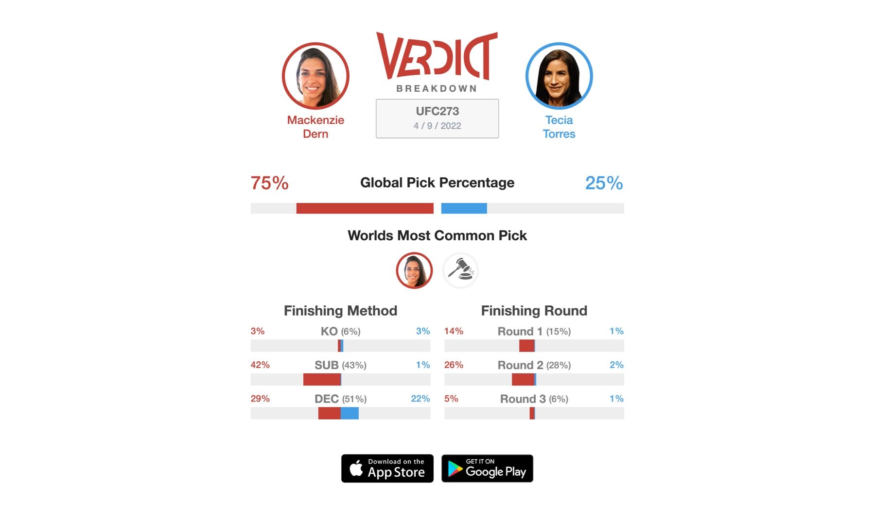 Mackenzie Dern had a 4 fight winning streak snapped in her last fight against Marina Rodriguez. She’ll get her opportunity to get back on track when she takes on Tecia Torres at UFC 273. Torres’ only losses in the UFC have come against Jéssica Andrade, Joanna Jędrzejczyk, Weili Zhang, and Marina Rodriguez. 3 of those women are former UFC Champions while Rodriguez is likely to be fighting for a Champion in 2022. Simply put, Torres has only lost to the best of the best. Torres is currently on a 3 fight winning with a win against Angela Hill in her last fight. With that said, she's still a big underdog headed into this fight with 75% predicting Dern to defeat her.