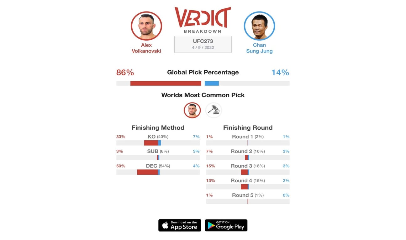 After Alexander Volkanovski defeated Brian Ortega, the original plan was for him to have a 3rd fight against Max Holloway at UFC 272. However, an injury forced Holloway to withdraw. Volkanovski didn’t want to wait for Holloway to recover, so he asked the UFC to set up another fight. Chan Sung Jung stepped in to challenge Volkanovski for the UFC Featherweight title. Jung is no stranger to title fights, as he first competed for the UFC Featherweight title in August of 2013 against Jose Aldo. Jung lost the fight after suffering a dislocated shoulder. Jung went on a 4-year hiatus after his fight against Aldo because it was mandatory for him to serve in the South Korean military. Jung picked up where he left off when he returned to the sport in 2017, as he finished the likes of Denis Bermudez, Renato Moicano, and Frankie Edgar by knockout. As good as Jung is, the Verdict Community isn’t giving him much of a chance at UFC 273 with 86% predicting Volkanovski to defeat him. Nearly 9 years after his first title shot, the Korean Zombie will once again challenge for the UFC Featherweight title.