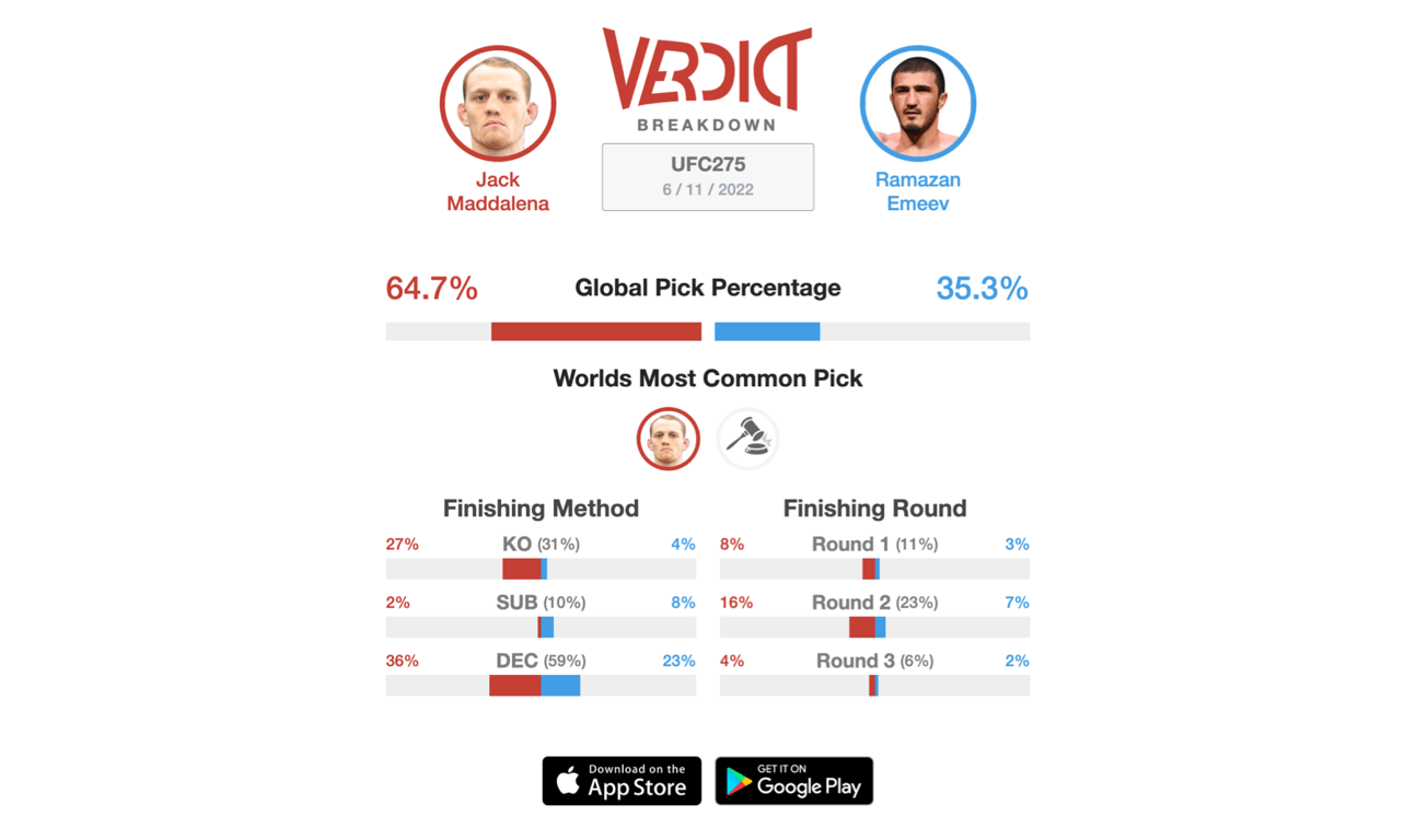 The Verdict community is expecting Maddalena to continue his rise in the division, with 64.7% of users picking him to defeat Emeev. Though 59% of the community expects this fight to go the distance, 27% do see Maddalena scoring another knockout in his sophomore UFC appearance.