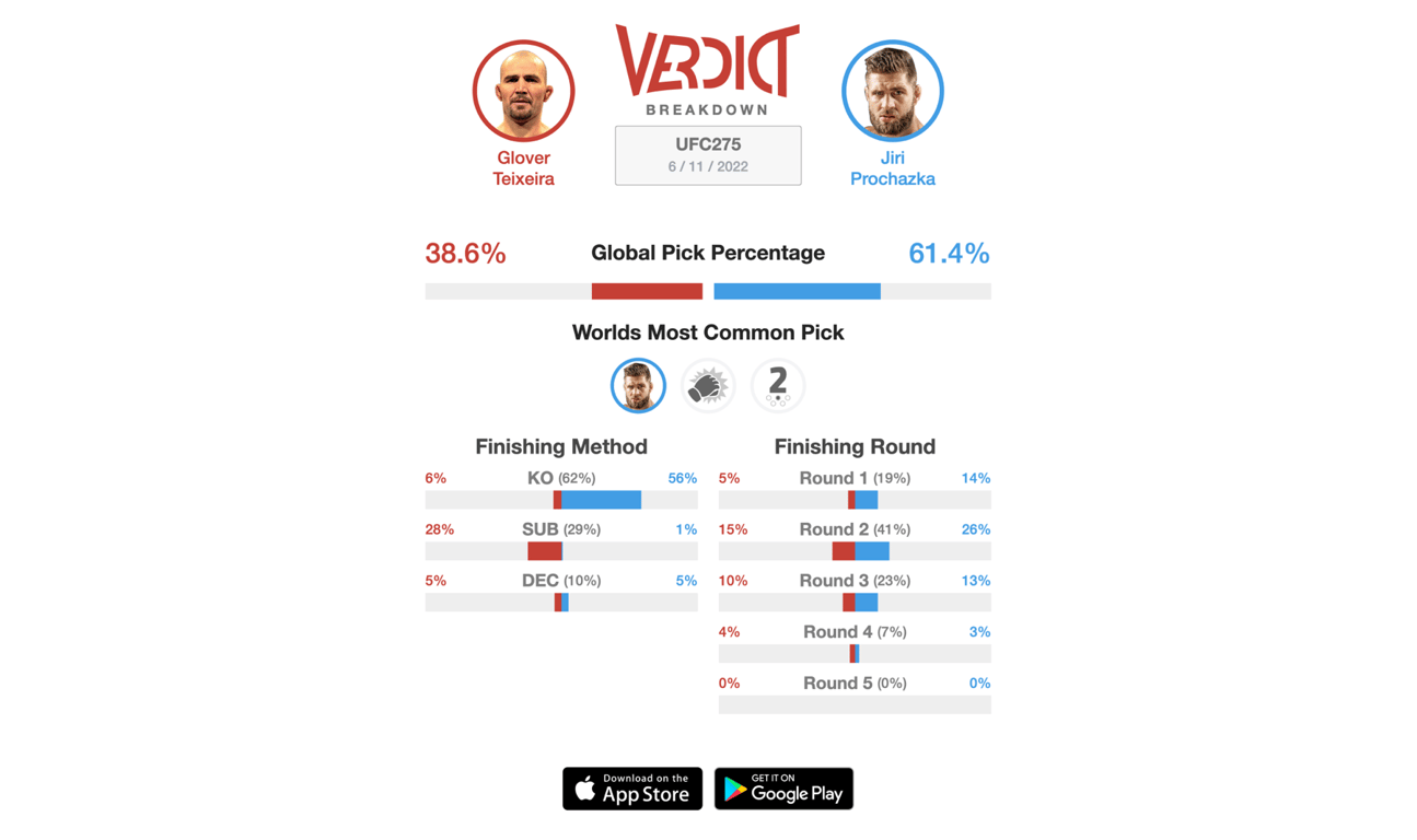 This is one of the closer fights on the main card, but 90% of the Verdict Community is expecting a finish in our main event. The community favors Prochazka to capture the title this Saturday, with 61.4% siding with the Czech knockout artist. 56% have Prochazka scoring the knockout win, with the world's most common pick being Prochazka by knockout in the second round.