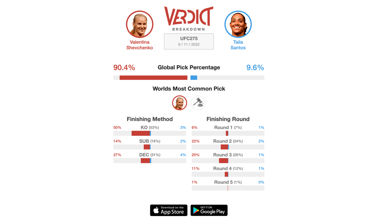 The Verdict Community is expecting Valentina to continue her dominance, with over 90% expecting her to get the nod. 64% of the community is expecting a Shevchenko stoppage, with an even 50% selecting that to come via knockout.