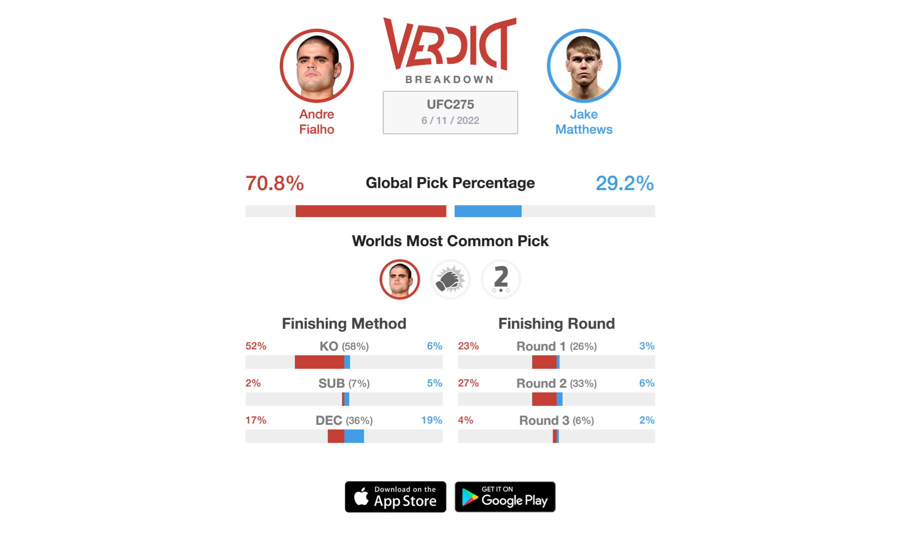 70.8% of the Verdict community has Fialho winning this fight. 52% expect him to get the knockout, with the most common pick being for him to get the KO in the second round.