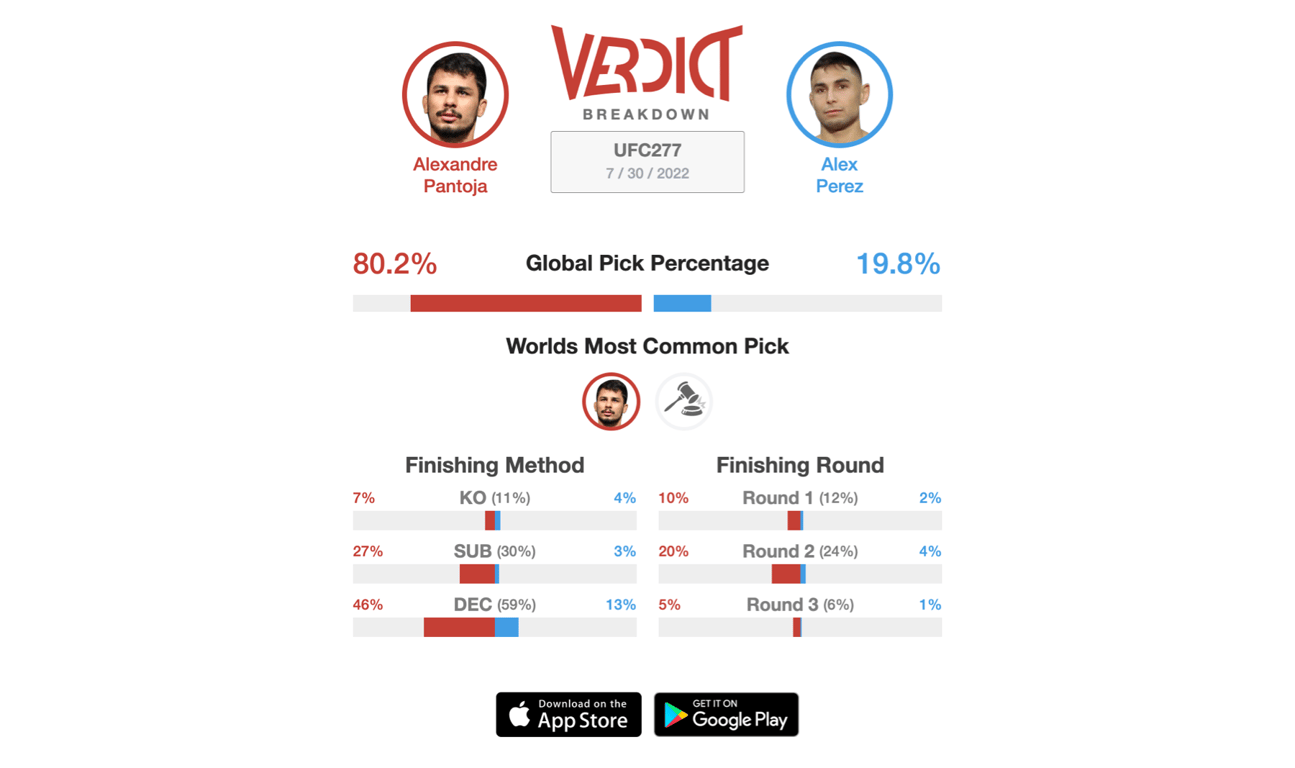 An important Flyweight bout takes place as Alexandre Pantoja goes against Alex Perez at UFC 277. Perez hasn't fought since 2020 when he lost to Deiveson Figueiredo at UFC 255. The reason for the inactivity has been from the multiple cancellations of fights throughout 2021. Perez had four fights fall out and this year, two more fights got cancelled as well. The opponents for these fights were Matt Schnell and Askar Askarov. If everything goes as planned, Perez will finally be making his walk to the ocatgon. He has a professional record of 24-6 with seven submission wins in his career. Standing across from Perez, Pantoja has been active as of late. Pantoja had two fights in 2021 and won both. He defeated Manel Kape via unamious decision and Brandon Royval via submission. Pantoja is one of the more exciting fighters in the Flyweight division as he has a 75% finish rate in his professional career. It's an interesting matchup between the two as it is a huge fight in the top five of the Flyweight division. Where it stands now, 80.2% of the Verdict Community predict Alexandre Pantoja to defeat Alex Perez at UFC 277.