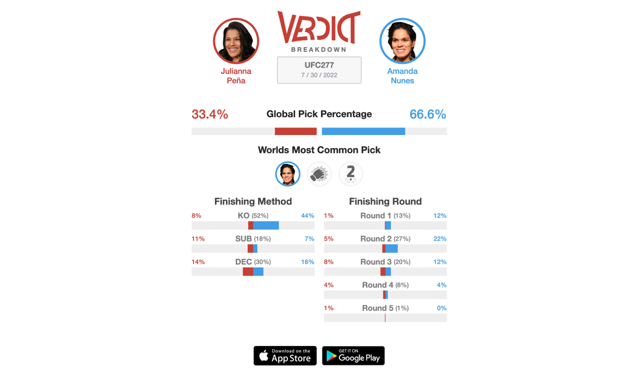 A rematch from UFC 269 when Julianna Pena shocked the world and defeated Amanda Nunes is finally upon us. Pena has been the Bantamweight champion for over 7 months and she now has the opportunity to prove that the first fight was not a fluke. There are still a lot of doubters due to the fact that Nunes was not in great shape nor had a full camp. Nunes recently stated at media day that she had a lot of things go wrong for that camp. She listed complications like recovering from COVID-19 and dealing with several injuries throughout the way. This time, Nunes appears to be in great shape and wants to take back what was once hers. She stated, "This opportunity is to get my belt back, and I’m not letting anything doubt me. Actually, losing the belt fired me up again.” On the flip side, Pena is looking to prove everyone wrong a second time. Pena made Nunes uncomfortable at UFC 269 and got her into wild exchanges. This allowed Pena to capitalize on big opportunites and she did just that. Pena rocked Nunes on the feet and eventually got the fight to the ground when she won via submission in the second round. It was one of the biggest upsets in UFC history as the MMA world was going crazy. Pena has the chance to not only do it again, but show everyone that she is the champion for a reason. As of now, 66.6% of the Verdict Community predicts Amanda Nunes will be getting her belt back against Julianna Pena.