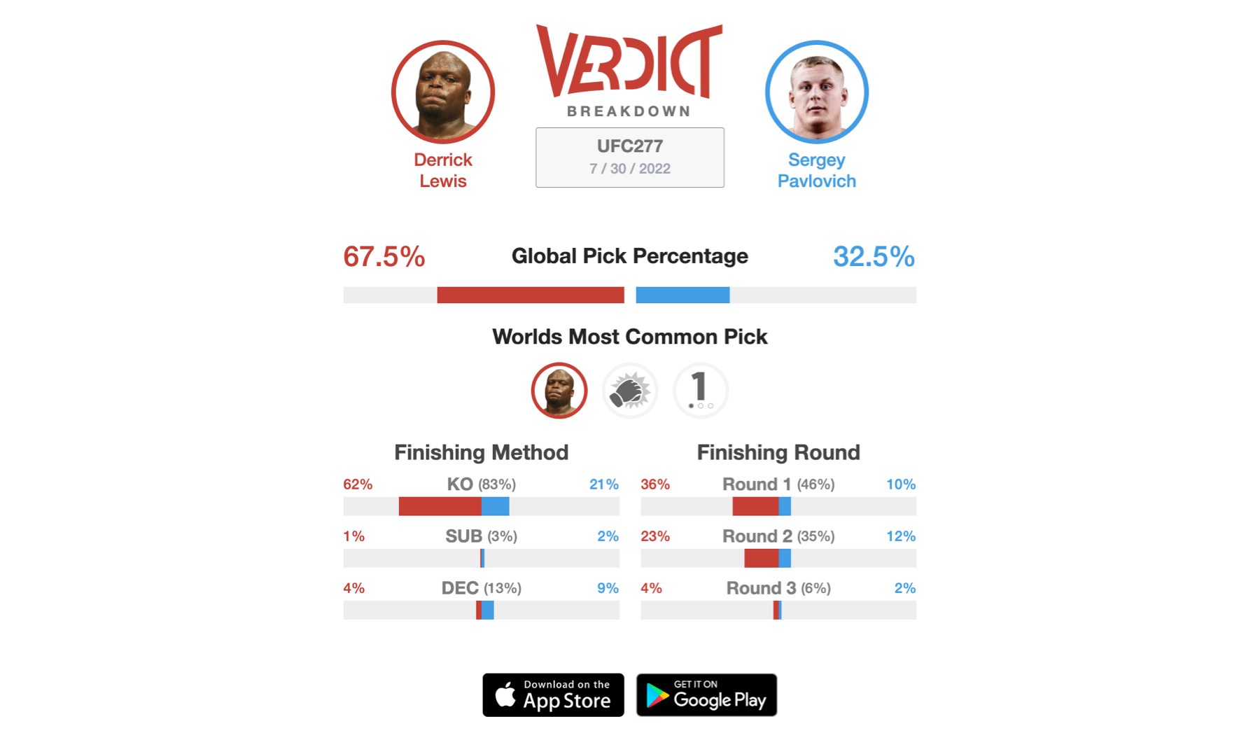 Fan-favorite Derrick Lewis returns to the octagon against the eleventh ranked contender in the Heavyweight division, Sergey Pavlovich. Lewis last fought at UFC 271 when he lost to Tai Tuivasa via knockout in the second round. Prior to that, Lewis looked great against Chris Daukaus when he won via knockout in the first round. Everyone knows that Lewis brings that "stand and bang" mentality to the octagon. Lewis has the most knockouts in the history of the Heavyweight division and will look to add to that total at UFC 277. It'll be no easy task as Pavlovich has been on a roll as of late. Pavlovich is on a three-fight knockout streak and all three wins have been in the first round. He lands at a high rate as Pavlovich averages six signifcant strikes landed per minute. The downside is he also absorbs 4.45 signifcant strikes per minute, which is also extremely high. Nevertheless, this fight has all of the makings to be exciting as both men have one-punch knockout power. As of now, nearly 68% of the Verdict Community are taking the side of Derrick Lewis. The world's most common pick is also Lewis by first-round knockout.