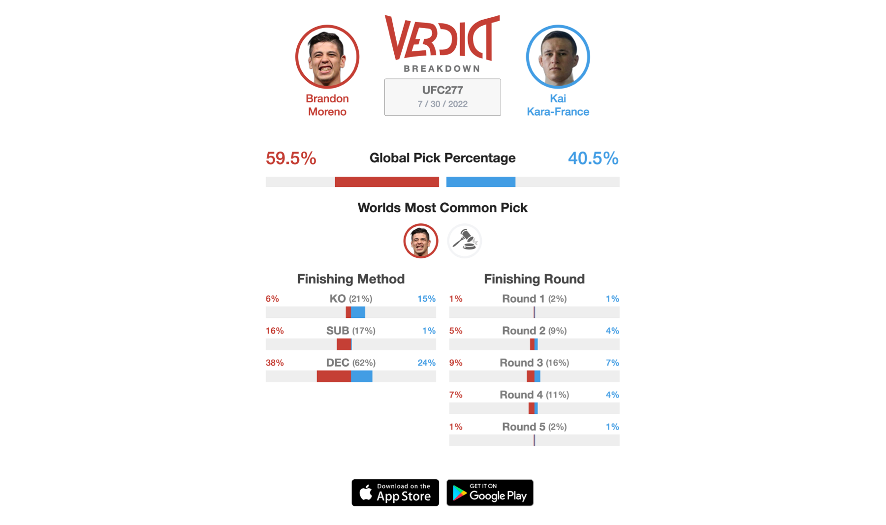 Another rematch is on deck at UFC 277 but this time, the stakes are higher. Brandon Moreno and Kai Kara-France will be fighting for the Interim Flyweight belt and the winner will have a future match to unify the belt against the undisputed champion Deiveson Figueiredo. Nonetheless, the winner this weekend does become a champion at the end of the night. Moreno and Kara-France first fought in December of 2019 at UFC 245. Moreno earned a unamious decision victory at the end of the night in a fight that was closely contested. There was a lot of back-and-fourth action between the two for three rounds. The difference now is that they will have five rounds (if needed) to determine the winner. Since the first fight, both men have changed drastically. Moreno would build his way up to challenge for the title at UFC 256, which ultimately ended in a draw against Figueiredo. The UFC instantly booked the rematch for UFC 263 when Moreno became the new Flyweight champion when he defeated Figueiredo via submission. A few months later, the trilogy would take place at UFC 270 when Figueiredo earned a decision victory to re-capture the Flyweight title. On the other side, Kara-France has been on a tear. He comes into UFC 277 on a three-fight winning streak while having two first round knockout wins. In that span, Kara-France finished Rogerio Bontorin and Cody Garbrandt in round one and recently earned a unanimous decision win over top contender Askar Askarov. In his last two fights, Kara-France was the underdog and has beaten the odds. At UFC 277, he'll be the underdog for the third straight fight in his career. Fans can expect an incredible fight as both fighters are great strikers. Where it stands now, nearly 60% of the Verdict Community are predicting Brandon Moreno to defeat Kai Kara-France at UFC 277.