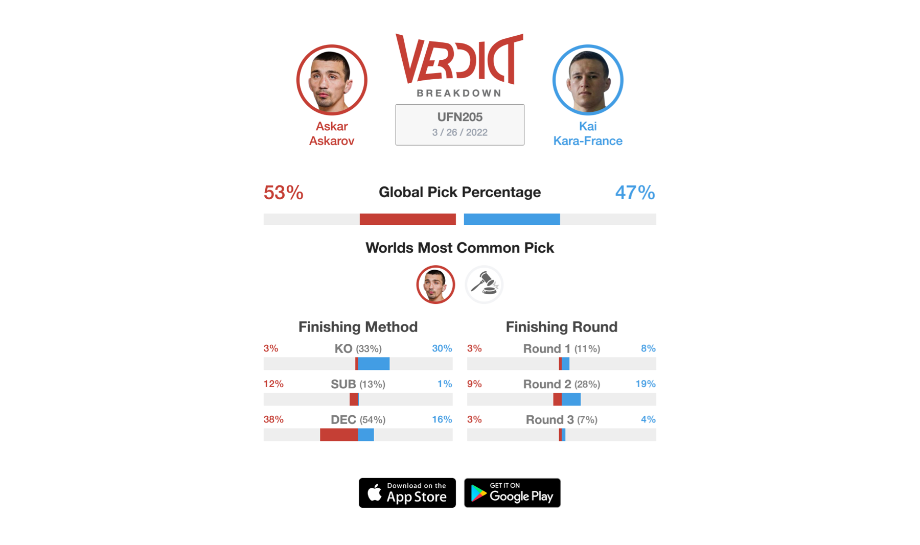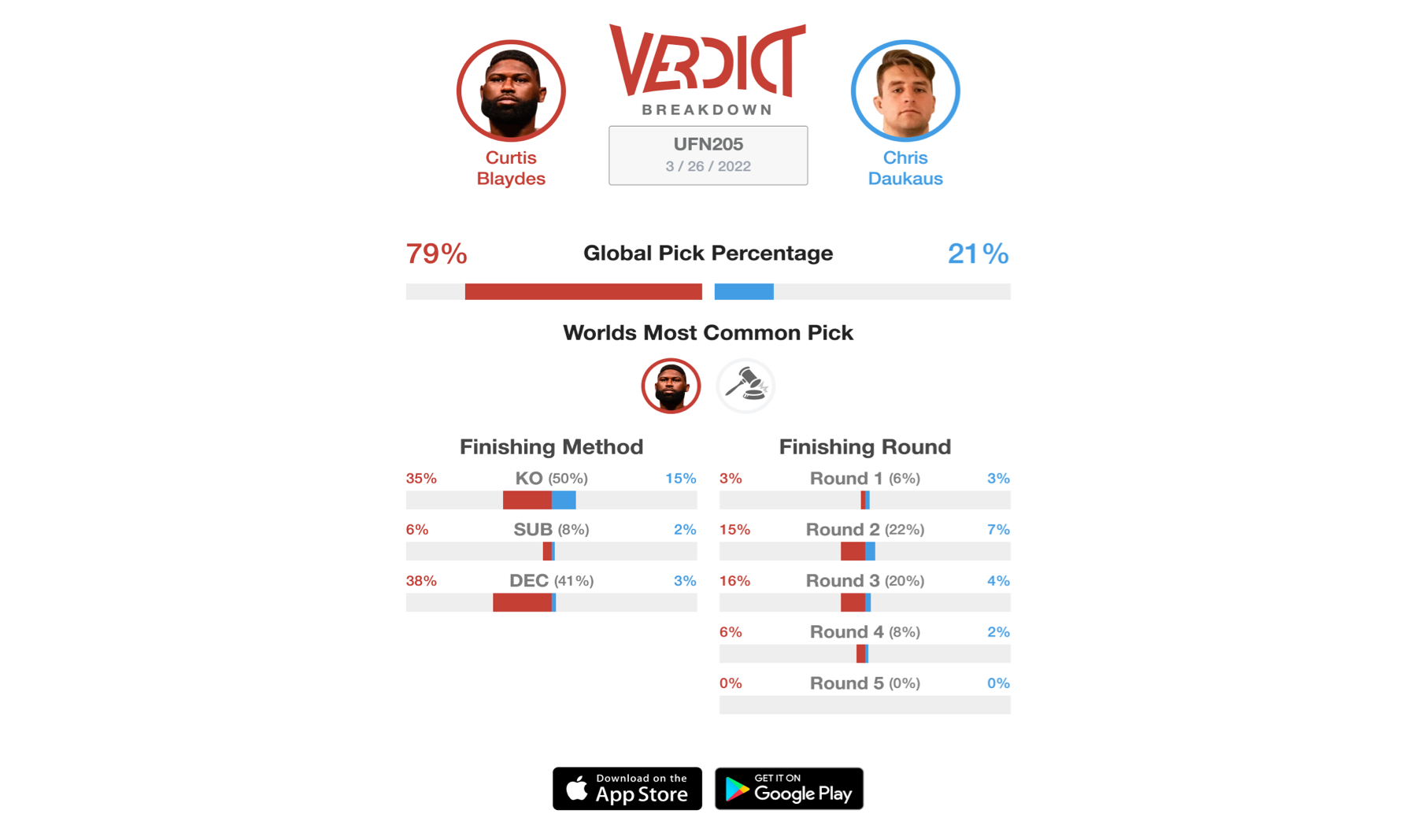 Since making his professional debut in 2014, Curtis Blaydes has only lost to two fighters: Francis Ngannou and Derrick Lewis. He’s defeated every other fighter he’s fought. Blaydes will compete in his 5th UFC main event this weekend when he takes on Chris Daukaus. After winning 5 consecutive fights by knockout, Daukaus lost to Derrick Lewis in his last fight. Daukaus has never lost a fight by decision, but 39% of the Verdict Comunity are predicting Blaydes to defeat him by decision. Blaydes is a big favorite heading into this fight, with 79% predicting him to win.