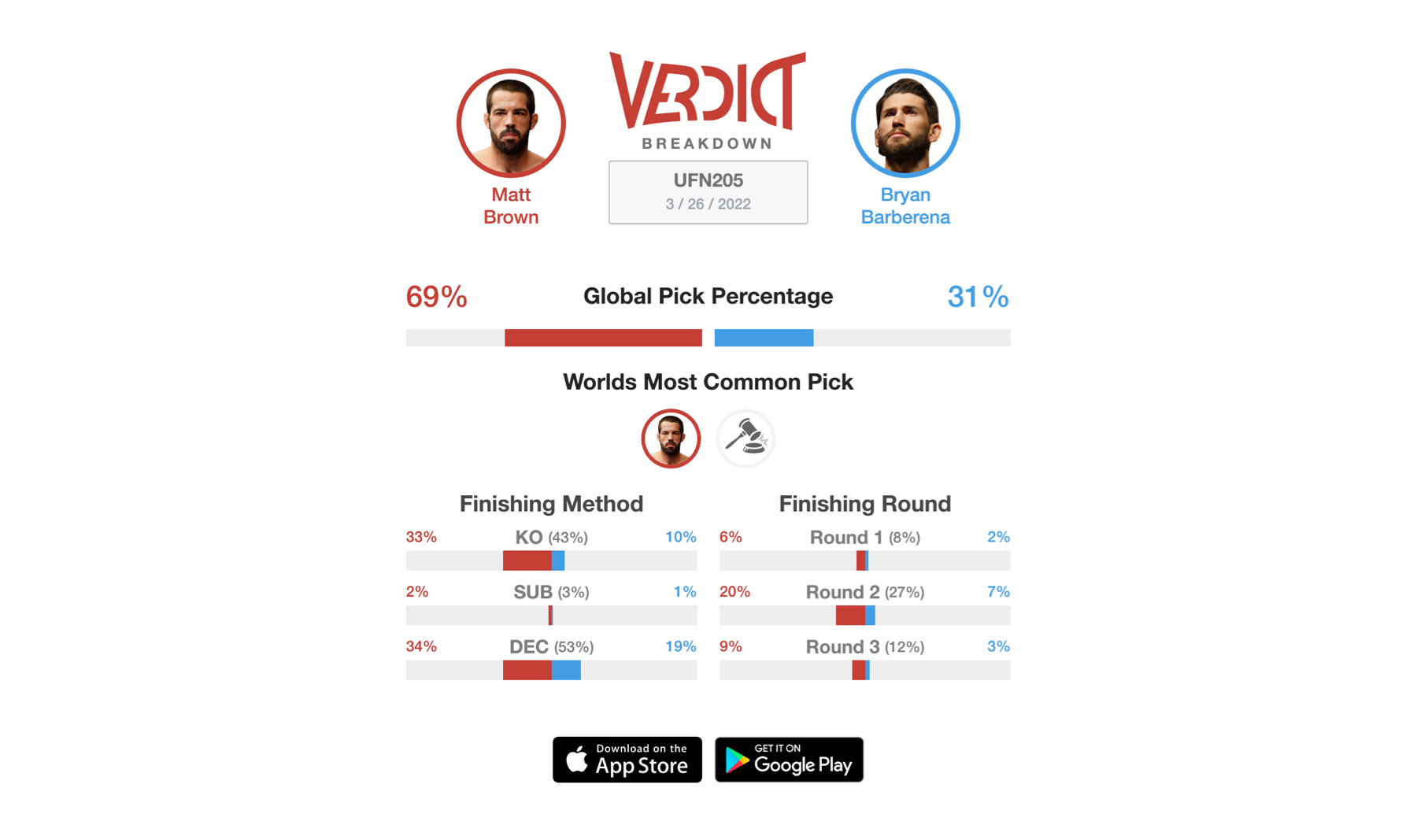 Any time Matt Brown fights, you know there’s going to be action. He made his UFC debut in 2008 and he’s still finishing opponents today. Brown is coming off of a knockout win against Dhiego Lima who’s the brother of former Bellator Champion Douglas Lima, who Brown also previously finished. Brown will be taking on 7-year UFC veteran Bryan Barberena. The world’s most common pick is for Matt Brown to win by decision at 34% with 33% predicting Brown to win by knockout.