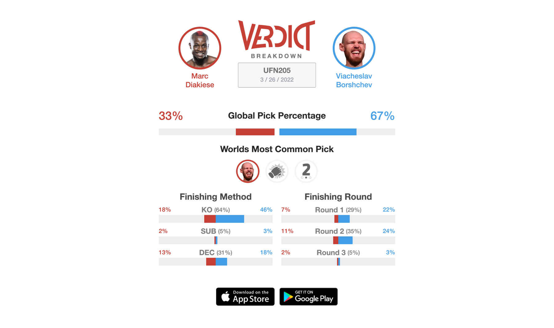 A lightweight battle between Marc Diakiese and Viacheslav Borschev will kick off UFC Columbus. Borschev is currently on a 4 fight streak where he’s finished every opponent by knockout. Nearly half of the Verdict Community predicts he’ll continue that streak, with 46% predicting Borschev to finish Diakiese by knockout.