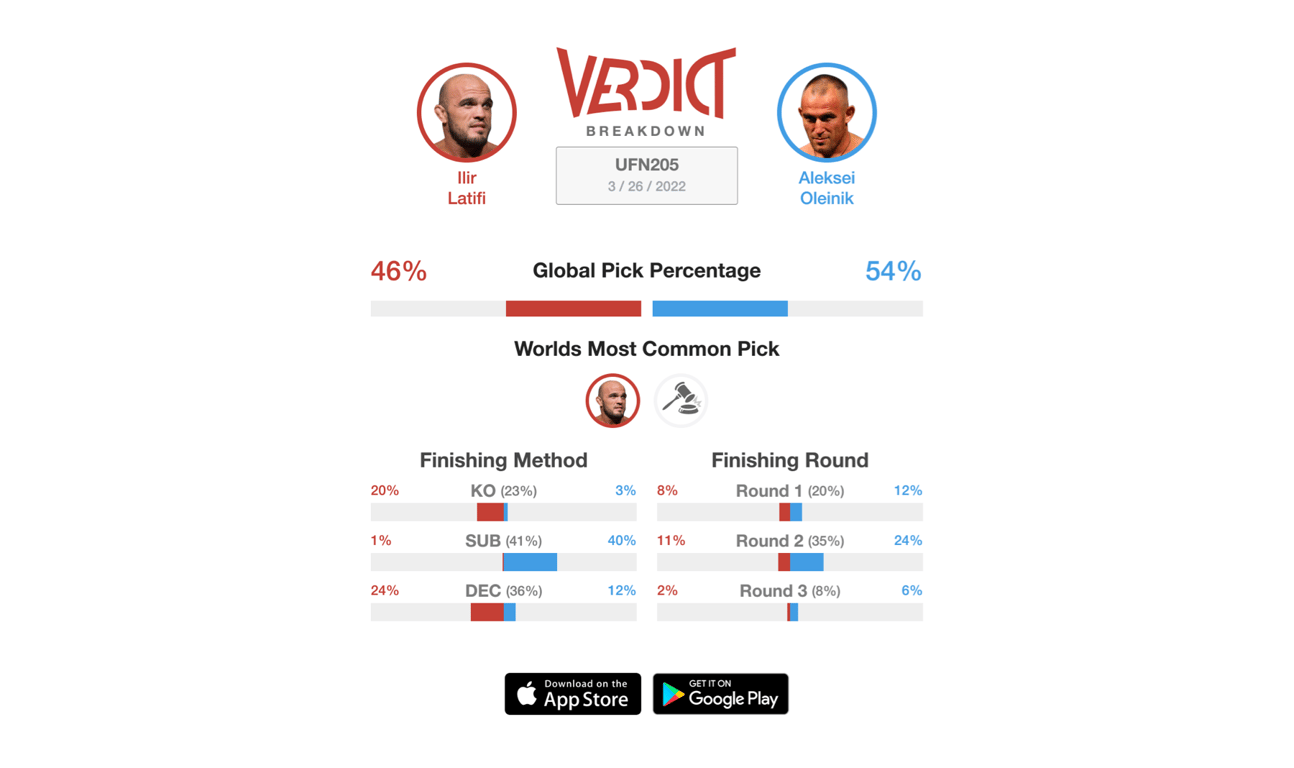 When Alexey Oleynik made his professional MMA debut, Bill Clinton was the President of the United States. Oleynik will compete in his 77th professional fight this weekend when he takes on Ilir Latifi. This could be the end of Oleynik’s run in the UFC, as he’s in danger of losing his 4th consecutive fight. Oleynik currently has 46 submission wins and 40% of the Verdict community predicts he’ll secure his 47th submission when he takes on Latifi.