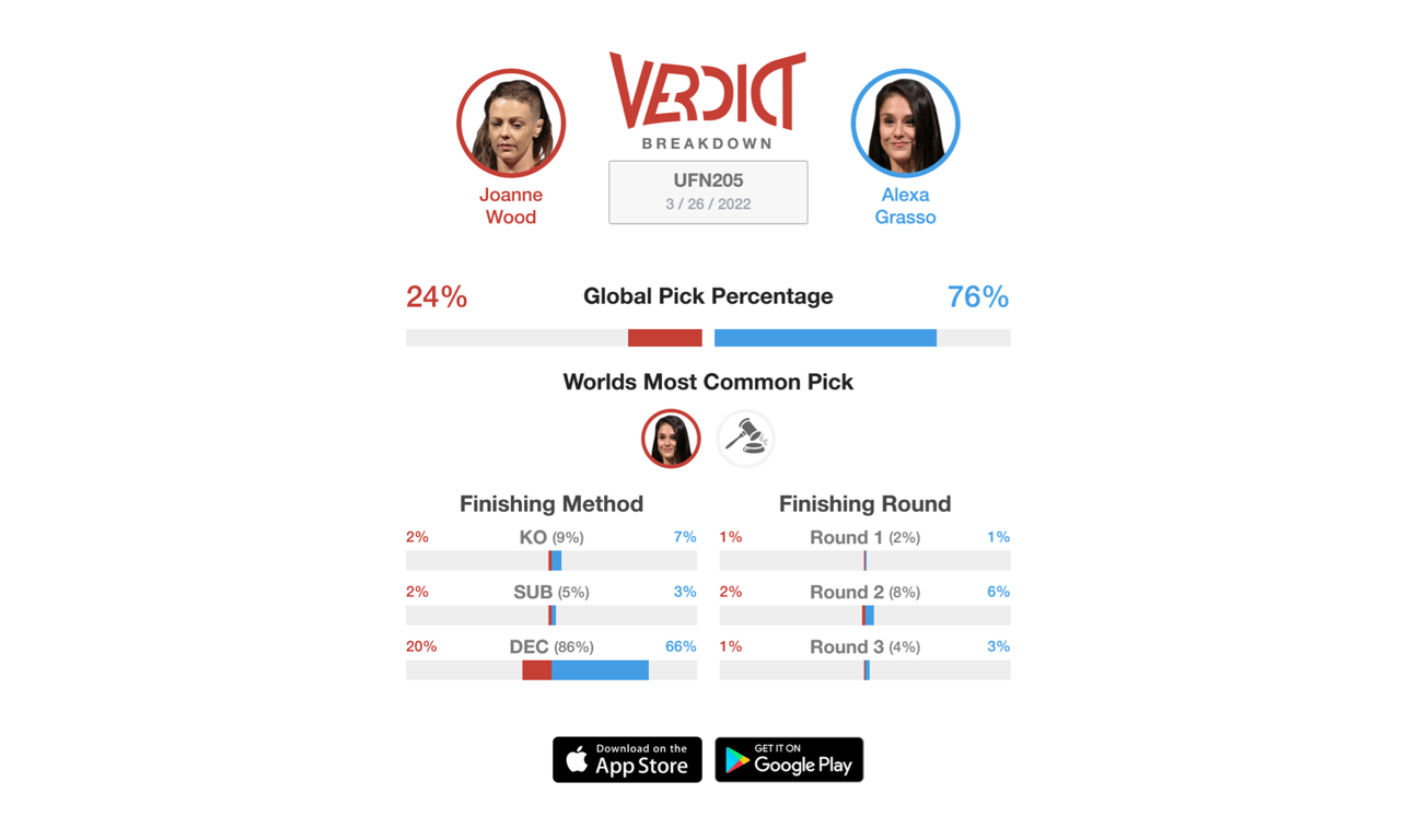 Prior to making her UFC debut, Alexa Grasso was undefeated at 9-0. She failed to find consistency in the Octagon as she was never able to win more than one fight at a time. That’s changed since she made her Flyweight debut in August of 2020 against Yi Jeon Kim. Grasso has won back to back fights and is looking to extend her winning streak to 3 when she takes on Joanne Wood this weekend. The Verdict Community is confident in Grasso, with 76% predicting her to defeat Wood. Joanne Wood is in danger of losing her 3rd straight fight which would be the longest losing streak of her career.