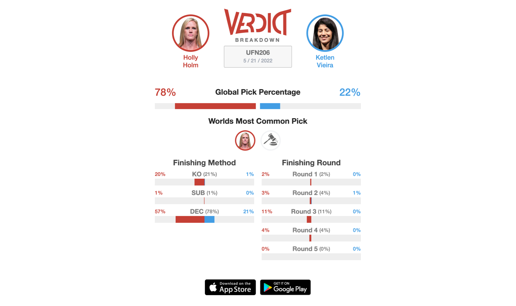 Nearly 80% of the Verdict Community are siding with Holm to get the victory this weekend, with 57% expecting her to win the fight via decision.