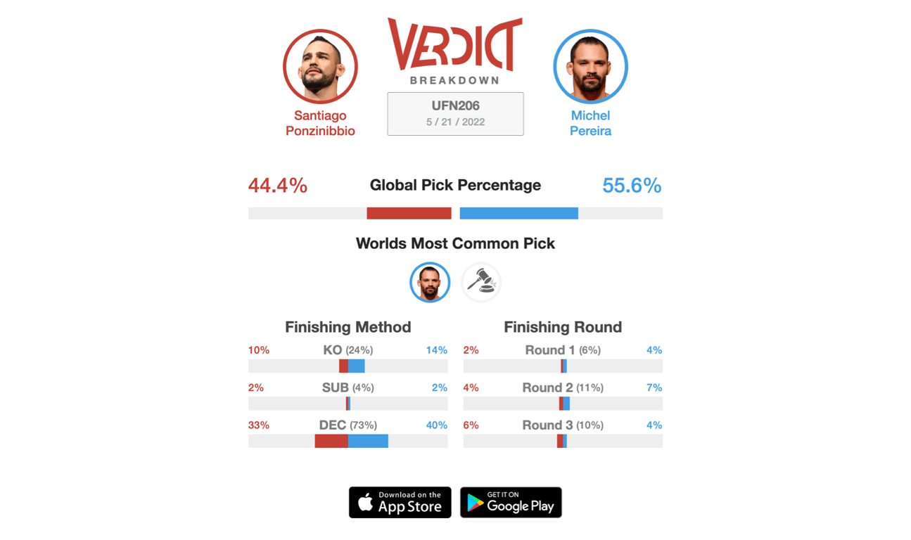 This fight will assuredly give the fans some fireworks on Saturday night, and the Verdict Community likes Pereira as a slight favorite, with almost 56% predicting him to get the nod. Despite both fighters being credentialed knockout artists, 73% of the Verdict Community expect us to see the judges' scorecards in this bout.