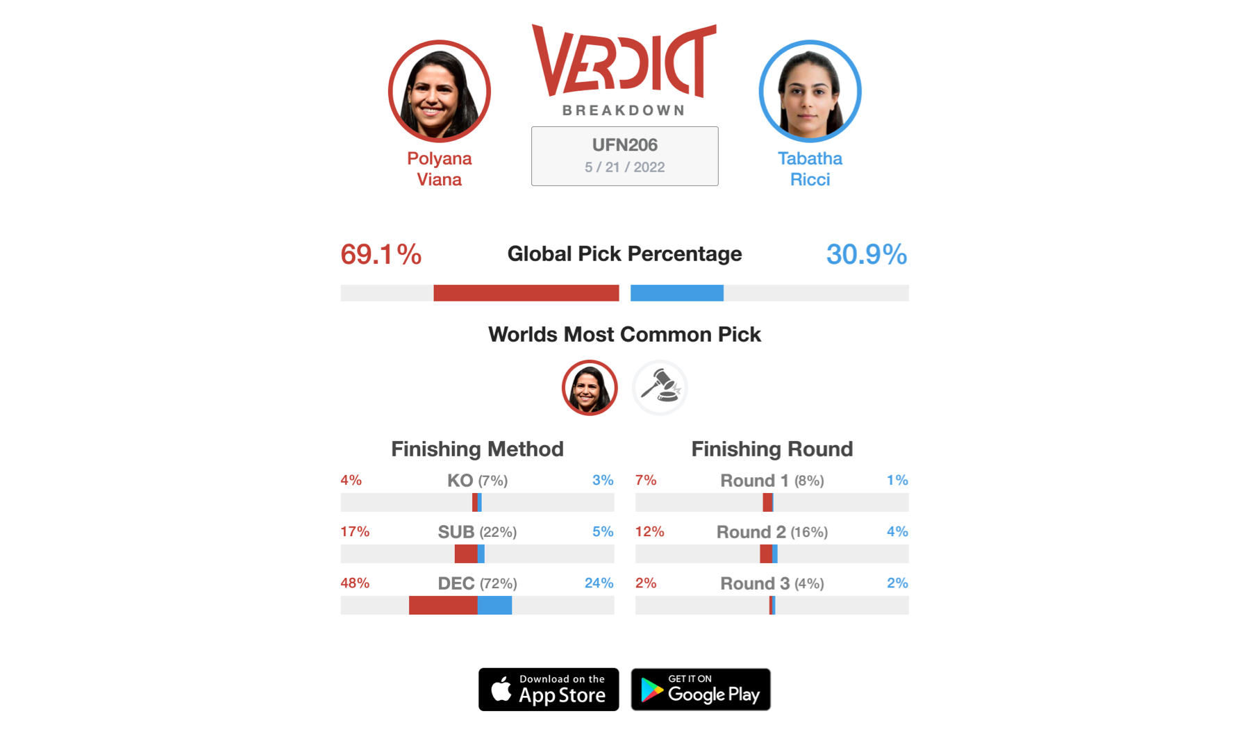 A little over 69% of the Verdict Community like the offensive pace of Viana to win the fight, despite her being a slight underdog on the current betting lines! In addition, 48% see her winning a decision, which would be the first of Viana's career!