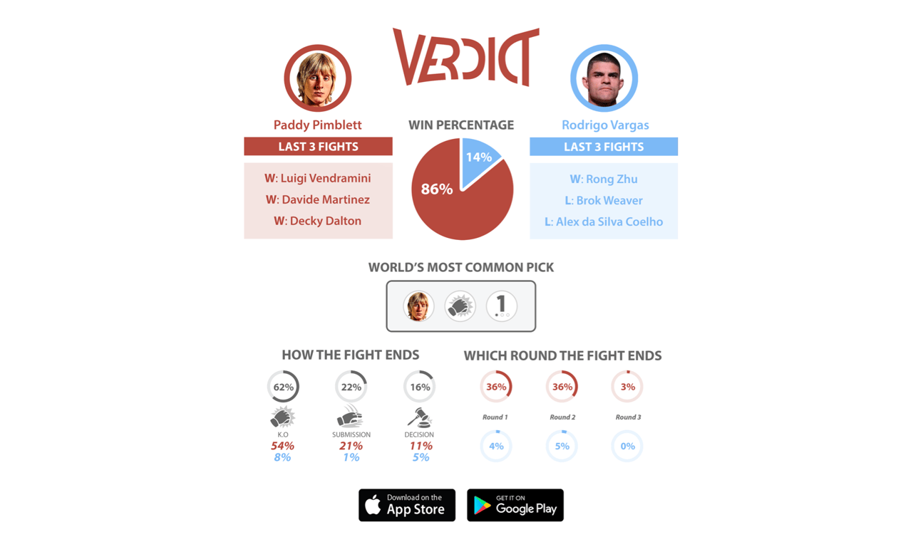 Paddy Pimblett has only had one fight in the UFC and he’s already become one of the most popular prospects in the sport. He’s charismatic outside the Octagon and has a killer instinct when he competes. He made his successful UFC debut last September, finishing Luigi Vendramini by knockout. Pimblett is already a big star in the UK, as he’s a former Cage Warriors Featherweight Champion. Pimblett is a big favorite, with 86% of the Verdict Community predicting him to defeat Rodrigo Vargas. The world’s most common pick is Paddy Pimblett to win by 1st round knockout.