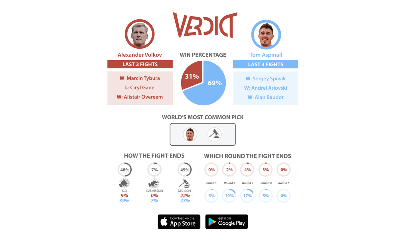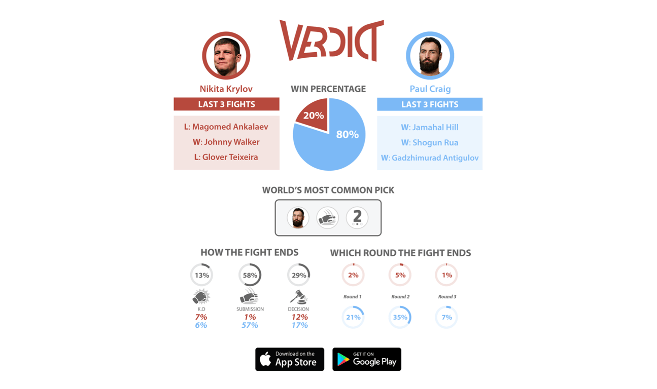 After a 9 month absence from the Octagon, Paul Craig will return to action when he takes on Nikita Krylov. Craig earned performance of the night honors in his last fight when he viciously finished Jamahal Hill with elbows while in a triangle choke. Since he made his professional debut in 2013, 100% of Craig’s wins have come by stoppage. He’ll be fighting a fellow finisher in Nikita Krylov, who’s finished 96% of his wins. Given the backgrounds of both fighters, it’s likely we’ll see a finish in this fight with 71% of the Verdict Community predicting the fight to end by stoppage.