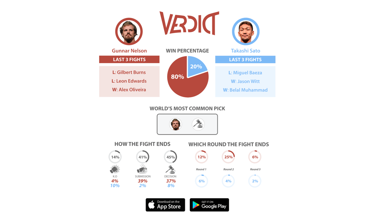 Gunnar Nelson will compete inside the Octagon for the first time in nearly 2 years when he takes on Takashi Sato. Nelson fought the best of the Welterweight division in his last 2 fights, losing against Gilbert Burns and Leon Edwards. Though Nelson has been away from the Octagon for a long time, the Verdict Community hasn’t forgotten about him with 80% predicting him to win. If Sato manages to defeat Nelson, this will be the biggest win of his career.