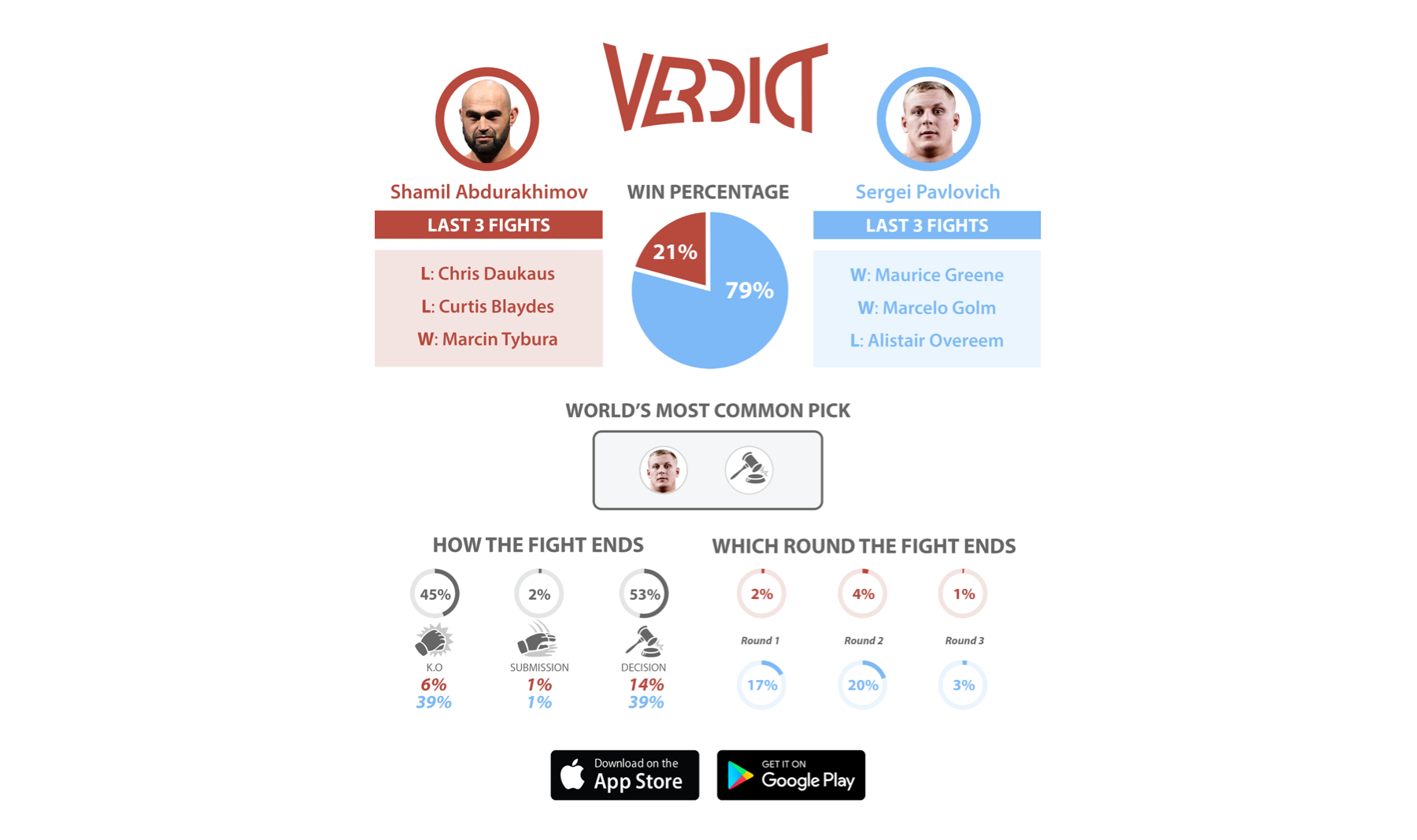 This is the lone Heavyweight fight on the card. Shamil Abdurakhimov is coming off back to back knockout losses while Sergei Pavlovich is coming off back to back knockout wins. Pavlovich has suffered only 1 loss in his professional career, dating back to December of 2014. As it stands, 39% of the Verdict Community are predicting Pavlovich to finish Abdurakhimov by knockout.