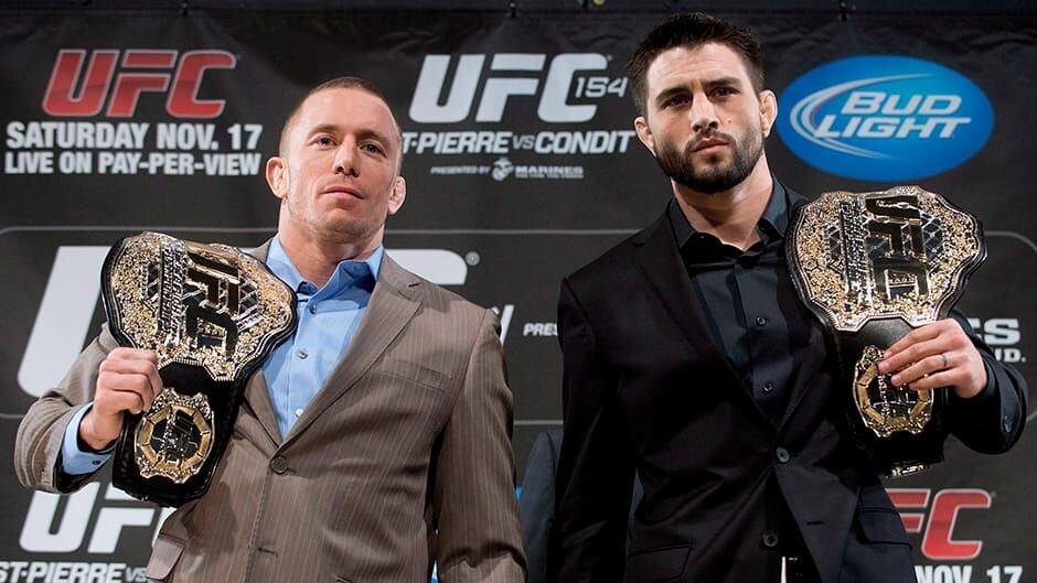 After the UFC purchased Strikeforce in 2011, they acquired many of Strikeforce’s fighters. One of those fighters was the reigning Strikeforce Welterweight Champion Nick Diaz. The UFC set up a blockbuster Champion vs. Champion fight between Nick Diaz and UFC Welterweight Champion Georges St-Pierre at UFC 137. However, the fight was scratched after Nick Diaz failed to attend a press conference for the event. Instead, the UFC booked a Welterweight title fight between GSP and Carlos Condit at UFC 137. GSP suffered a knee injury and his fight against Condit was scratched. With GSP sidelined, the UFC ordered an interim title fight between Carlos Condit and Nick Diaz at UFC 143. Condit defeated Diaz in a close fight to become the interim Welterweight Champion. An undisputed Welterweight title fight was booked between Condit and the returning Georges St-Pierre at UFC 154. The fight took place in GSP’s hometown of Montreal, Quebec. It was an action-packed fight that saw Condit almost finish GSP, but GSP was resilient and went on to defeat Condit by unanimous decision to remain the Undisputed Welterweight Champion.