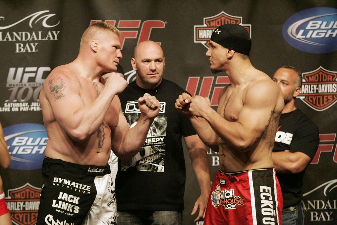 In February of 2008, former WWE Superstar Brock Lesnar made his UFC debut against Frank Mir at UFC 81. This was a major event for the UFC as many people were watching MMA for the first time. Brock Lesnar immediately charged towards Frank Mir when the fight began and started to attack. Referee Steve Mazzagatti halted the action after Lesnar hit Mir with punches to the back of the head. This was the turning point of the fight as Lesnar lost momentum. When the fight restarted, Mir secured and finished Lesnar with a kneebar, handing him the first loss of his professional career. Lesnar rebounded from this loss by defeating Heath Herring at UFC 87. Brock Lesnar was such a box office draw that the UFC granted him with a Heavyweight title shot against Randy Couture after just one win in the UFC. This was a return fight for Couture who was going through contract issues with the UFC, after trying to secure a fight against Fedor Emelianenko outside the Octagon. Before Couture decided to return to the UFC to fight Lesnar, the UFC had booked an interim Heavyweight title fight between Frank Mir and Antônio Rodrigo Nogueira. Both Lesnar and Frank Mir both finished their title fights by 2nd round TKO which set up a rematch between the two for the undisputed UFC Heavyweight title. The rematch would take place at UFC 100 which at the time was the biggest blockbuster event in UFC history. Lesnar avenged his loss to Mir by finishing by TKO to become the undisputed UFC Heavyweight Champion.