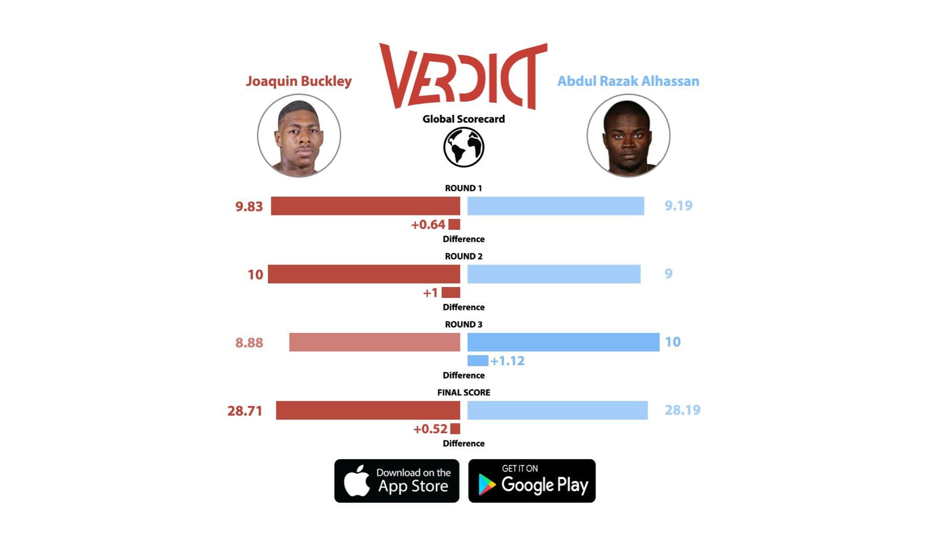 Many expected this fight to end by knockout, but Joaquin Buckley and Abdul Razak Alhassan went to a decision in a competitive fight which resulted in a split decision win for Buckley. Though Alhassan lost the decision, he had the most dominant round of the fight in the 3rd round. The Global Scorecard was close, with Buckley winning by a final score differential of 0.52 only.