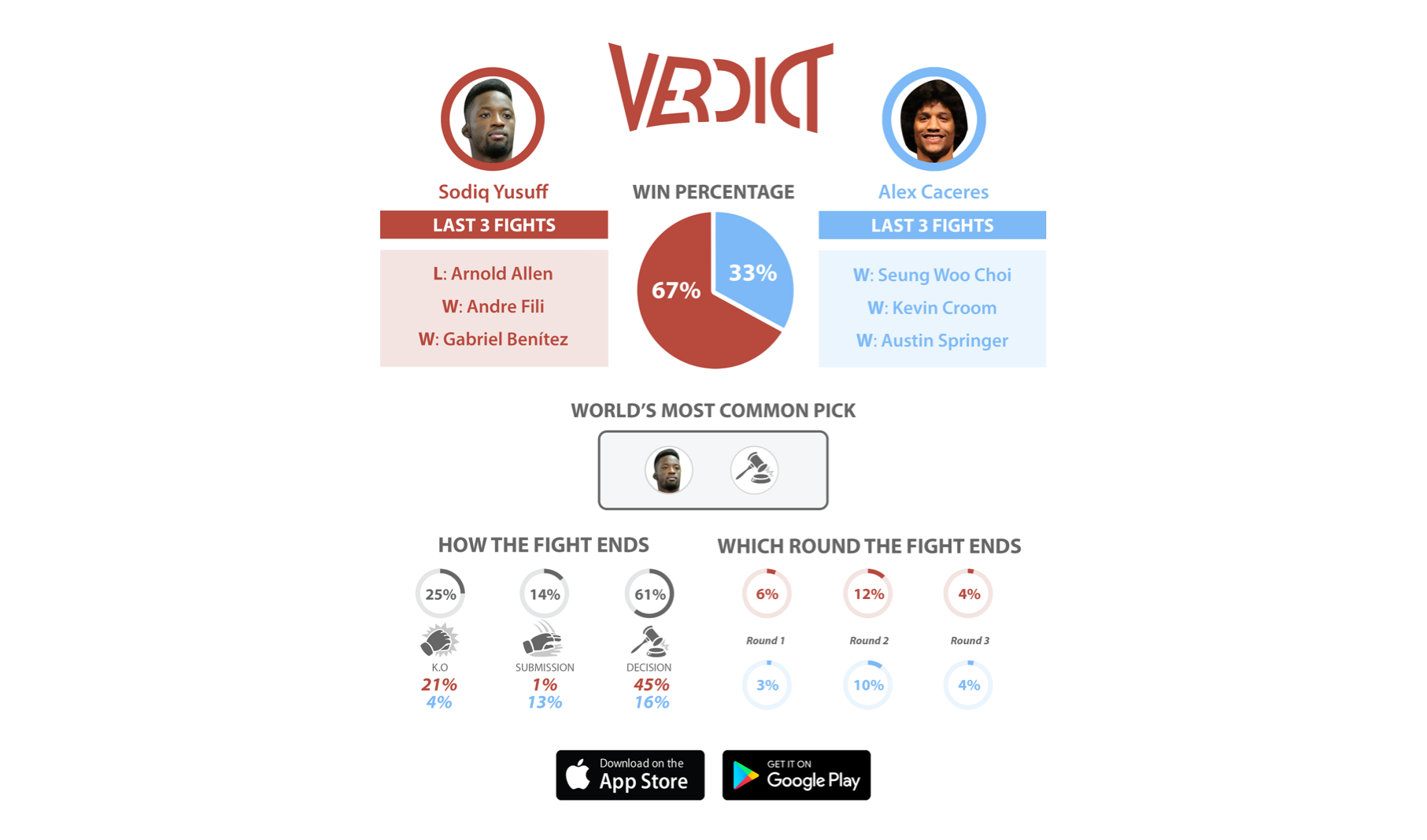 Alex Caceres has been competing as a professional fighter since 2008 and is currently on the longest winning streak of his career at 5 consecutive wins. Though Caceres has won 5 straight fights and Yusuff is coming off of a loss, 67% of the Verdict Community is still picking Yusuff to defeat Caceres. Before losing to Arnold Allen in his last fight, Yusuff was on a 6 fight winning streak where he had defeated the likes of Andre Fili and Gabriel Benitez.