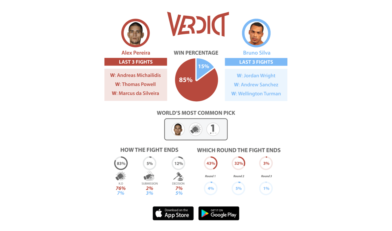 This main card is kicking off with an absolute banger with former Glory Kickboxing World Champion Alex Pereira taking on Bruno Silva. In March of 2017, Pereira finished current UFC Middleweight Champion Israel Adesanya by knockout inside a kickboxing ring. Prior to that, Pereira also defeated Adesanya by unanimous decision. Pereira brings a new level of striking to mixed martial arts and that was on full display in his UFC debut against Andreas Michailidis last November, when he finished Michailidis by knockout with a flying knee. What's being lost in the excitement to watch Pereira compete is how good his opponent Bruno Silva is. Silva is on a 7 fight winning streak where he’s finished every opponent by knockout. Silva has been competing as a professional fighter for 12 years and has never been finished by knockout. Pereira is fighting a fellow finisher. A lot of questions will be answered in this fight and it will kick off the action this weekend for the Verdict Community.