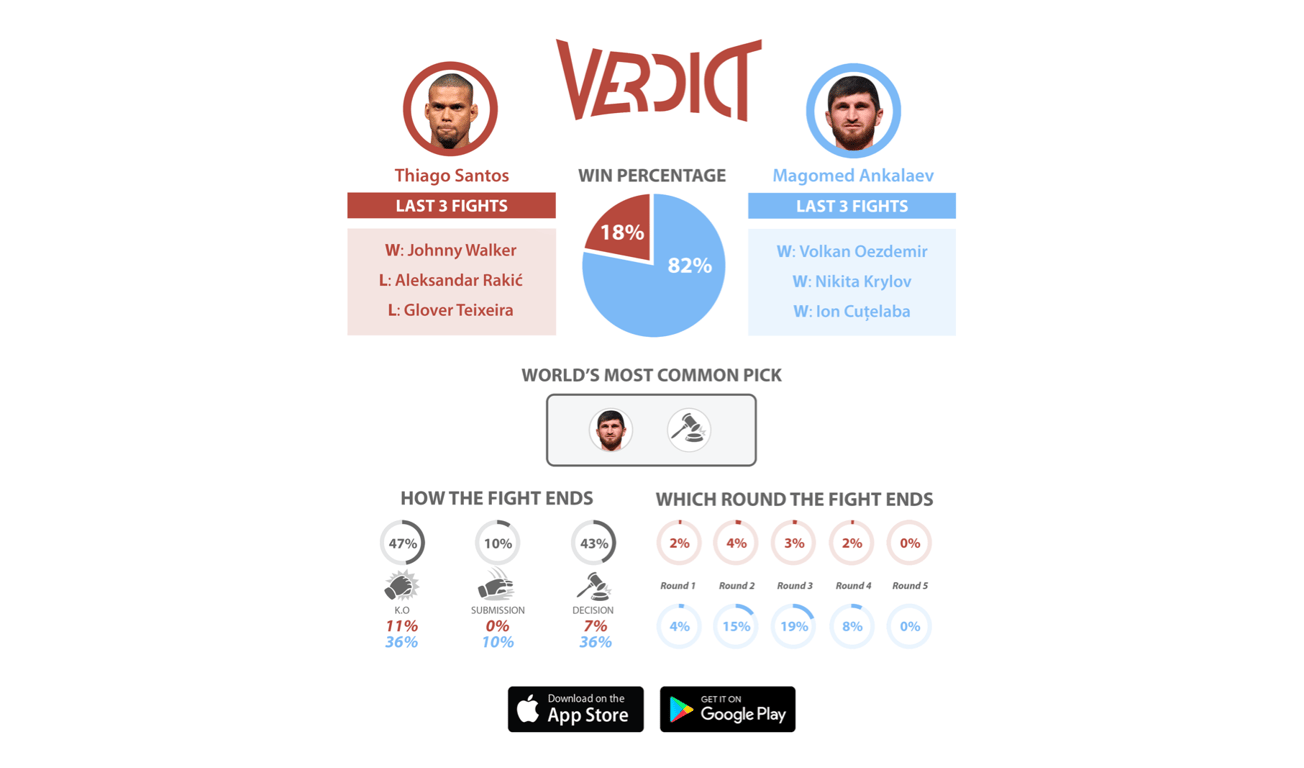 New talent has started to emerge in the Light Heavyweight division and one of those talents is Magomed Ankalaev who’s won 7 consecutive fights in the Octagon. Of those 7 wins, 4 have come by knockout. The only loss of Ankalaev’s 8-year professional career came against Paul Craig in March of 2018. Ankalaev will compete in his first UFC main event this weekend against former title challenger Thiago Santos. Santos has always been known for his aggressive style, but that hasn’t been the case in his last 2 fights. He was hesitant to attack like he’s done in the past. Ankalaev's style will force Santos to fight. The Verdict Community is confident in Ankalaev, with 82% predicting him to defeat Thiago Santos. If Ankalaev defeats Santos, he might be next in line to challenge the winner of Glover Teixeira vs. Jiří Procházka for the Light Heavyweight Championship. This is a high stakes matchup.