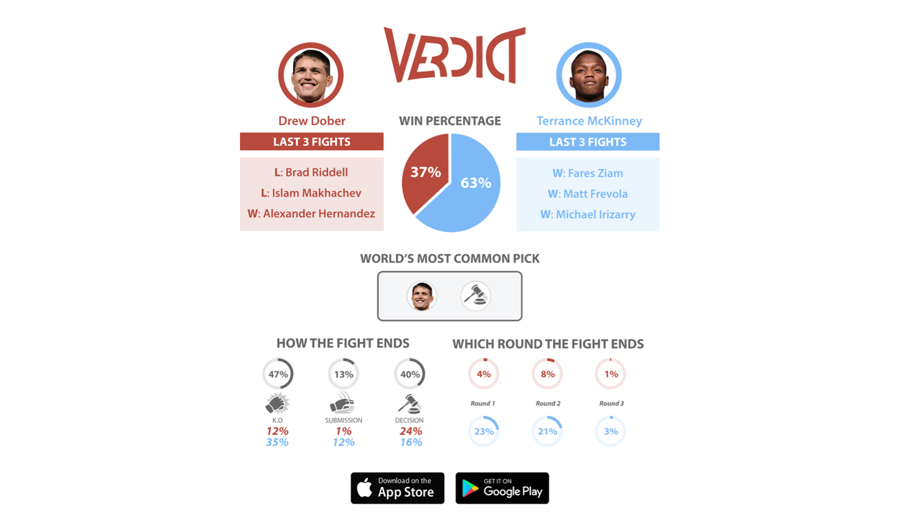 There are a lot of people that are excited for Terrance McKinney and for good reason. He’s charismatic, he wants to be a UFC Champion, and he has a 100% finishing rate. McKinney last competed on February 26th, when he finished Fares Ziam with a rear-naked choke. 14 days later, McKinney is stepping inside the Octagon once again as he competes in the biggest fight of his career against Drew Dober. Dober is a seasoned veteran that’s been competing in the UFC for nearly 9 years. Though McKinney is stepping in on short notice to fight Dober, he’s still the favorite on Verdict with 63% predicting him to win. If McKinney defeats Dober in the fashion that he’s defeated everyone else, he’ll get the attention of a lot of people.