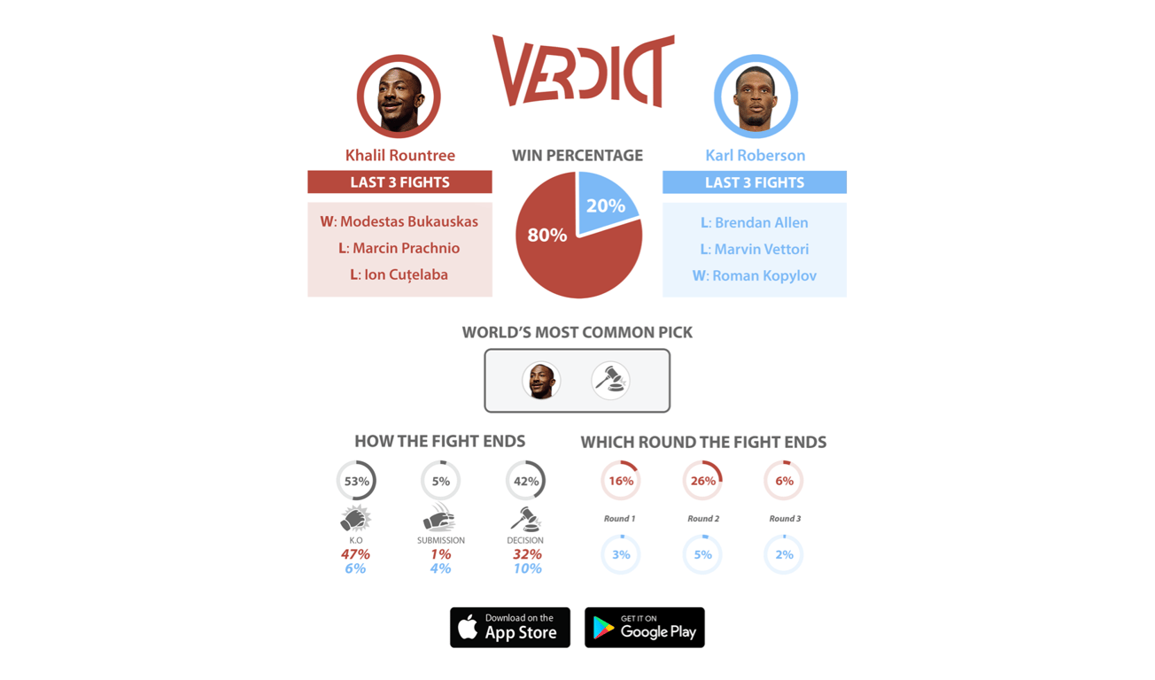 When Khalil Rountree last competed in September of 2021, he made a lot of people cringe watching at home. He blasted Modestas Bukauskas' knee with an oblique kick that blew out Bukauskas’ ACL, MCL, and PCL. This marked the first and only time in UFC history that a fight has been ended with an oblique kick. When Rountree is locked in, he’s one of the most dangerous strikers in his division. The Verdict Community is confident in Rountree heading into this fight against Karl Roberson, with 80% predicting Rountree to win and 47% predicting him to finish the contest by knockout.