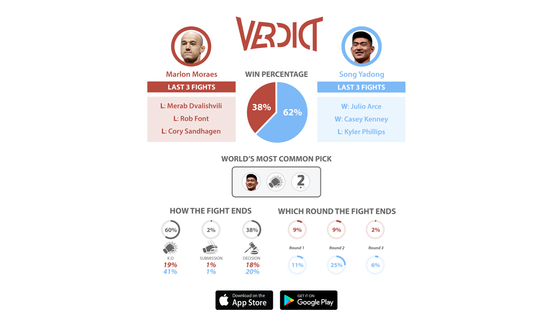 Marlon Moraes once looked like one of the best fighters in the world. Before he made his UFC debut in June of 2017, Moraes was the former WSOF Bantamweight Champion and was on a 6 year, 13 fight winning streak. He earned an opportunity to fight for the UFC Bantamweight title after finishing 3 consecutive opponents in the 1st round, including finishing current Bantamweight Champion Aljamain Sterling by knockout in 67 seconds. After losing his title shot to Henry Cejudo, Moraes’ career took a turn. He defeated Jose Aldo in a controversial decision then lost his last 3 consecutive fights by TKO. He’ll now take on rising contender Song Yadong who’s coming off of a TKO win himself. Much of the Verdict Community predicts a similar result going into this fight, with 41% predicting Yadong to finish Moraes by TKO. Yadong is fighting for the opportunity to catapult himself into the top 10 of the Bantamweight division, while Moraes is fighting to secure his spot on the UFC roster.