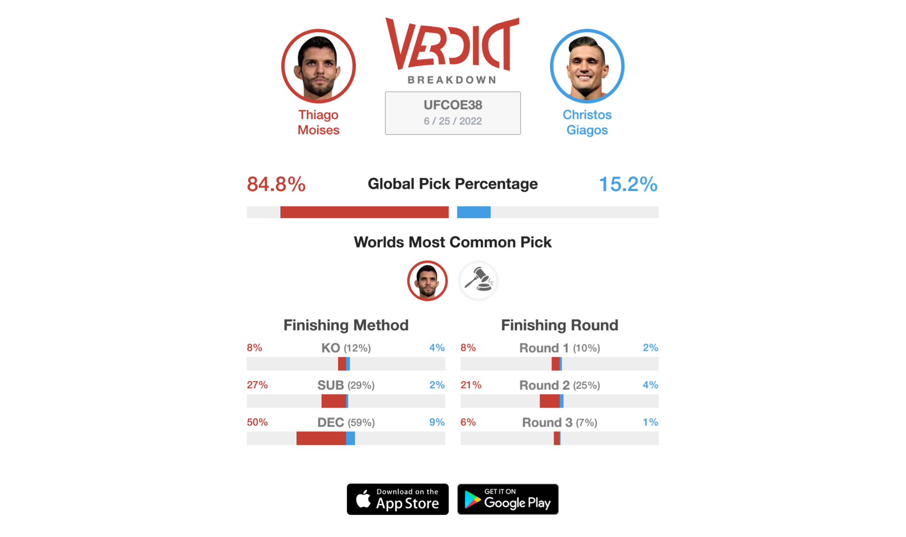 Despite losing his last two fights, Moises has shown some very clean boxing technique, as well as the ability to mix in a good low kick. He also has a very dangerous guard and is excellent at getting back to his feet after being taken down. Giagos, on the other hand, is coming off a loss to the headlining Arman Tsarukyan. Expect to see plenty of bouncing, blitzing, stance switching, and blast double legs from "The Spartan". The Verdict Community is fairly confident that this fight will go the distance, with Thiago Moises getting his hand raised.