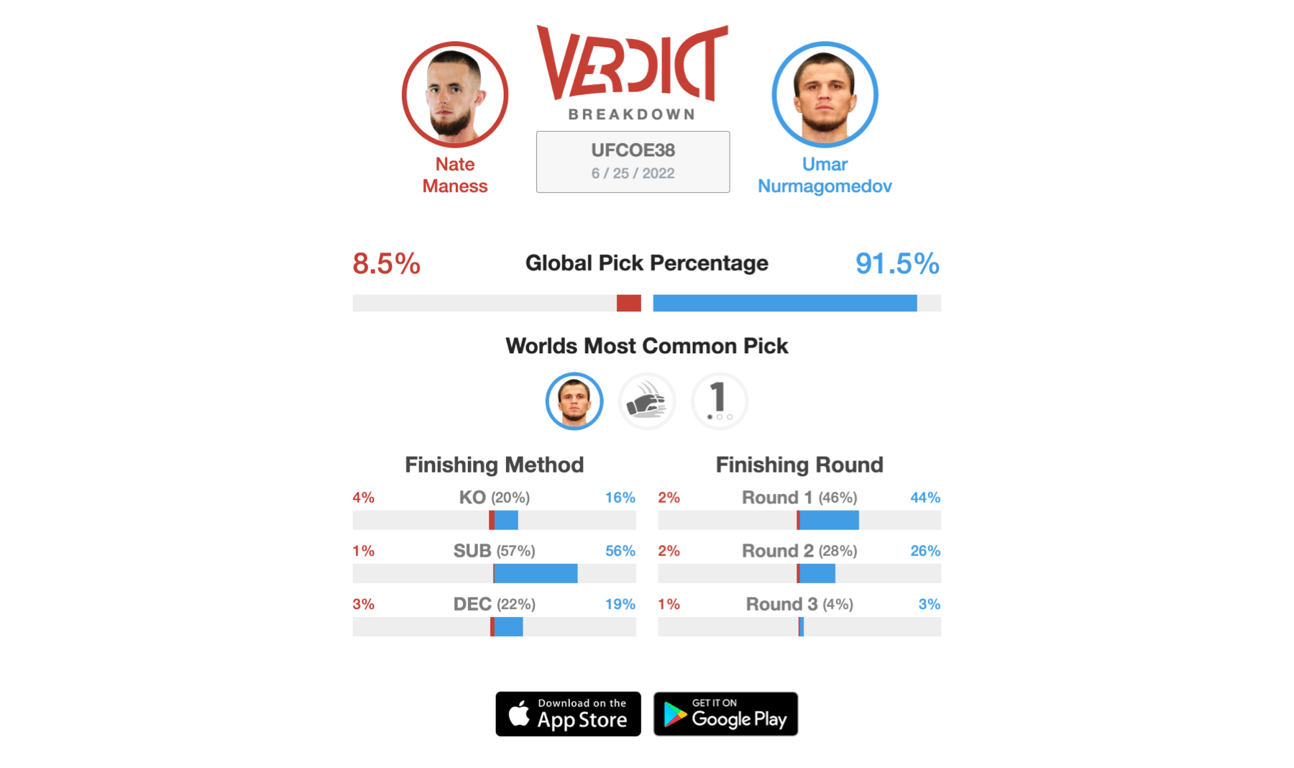 Nate Maness is not to be overlooked though, as "Mayhem" is on a four-fight win streak, three of those being by way of stoppage. What seems to make Maness so formidable thus far is his height. Nate Maness is a staggering 5'10", which certainly makes him one of the tallest athletes in the UFC's Bantamweight division. Being tall is only part of the equation though, as you must know how to effectively use your height and reach, and it seems like Maness does as he already has two stoppage victories in the UFC. As you could probably guess, The Verdict Community has Umar Nurmagomedov pegged as a huge favorite, with the majority of users predicting a first-round submission victory for the Dagestani standout.