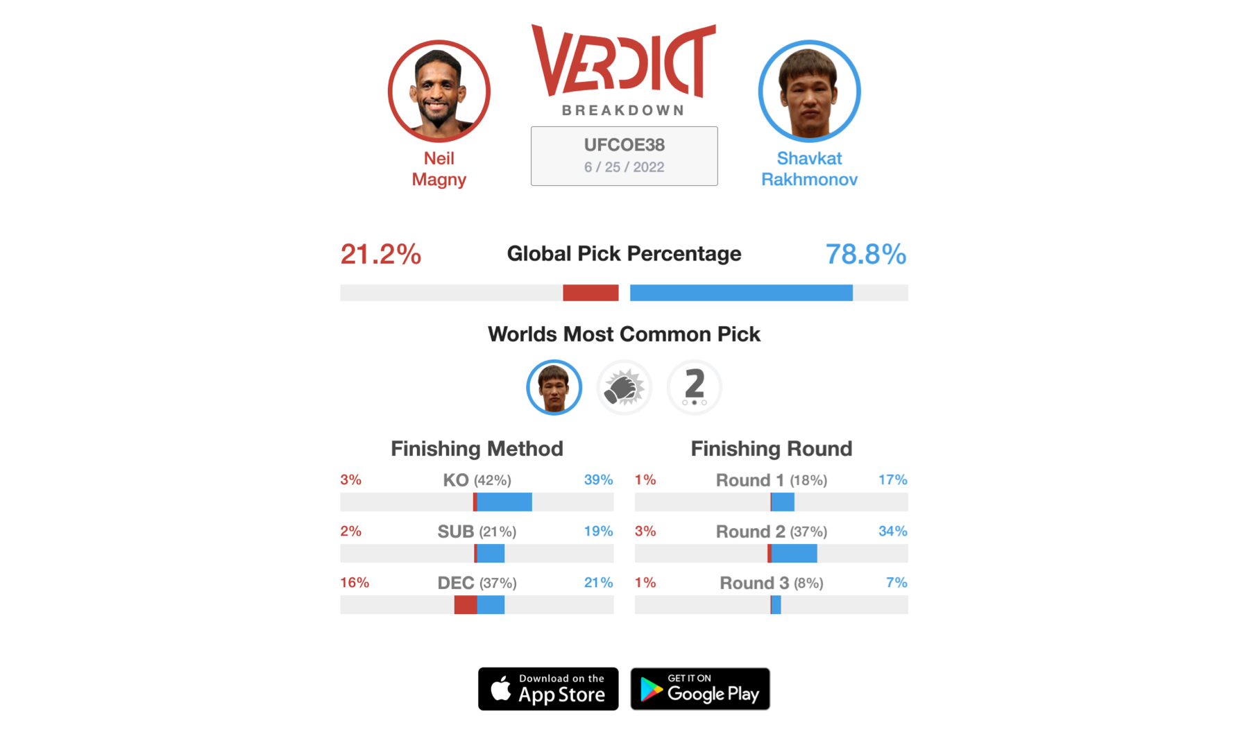 Magny comes into this bout with a two-fight win streak, both via decision. Conversely, "Nomad" has looked like an unstoppable force, holding a perfect fifteen-fight win streak, all by stoppage, and just three of those being under the UFC banner. The Verdict Community seems confident that not only will Shavkat Rakhmonov continue to add names to his flawless resume, but he will also earn a knockout victory in the second round.